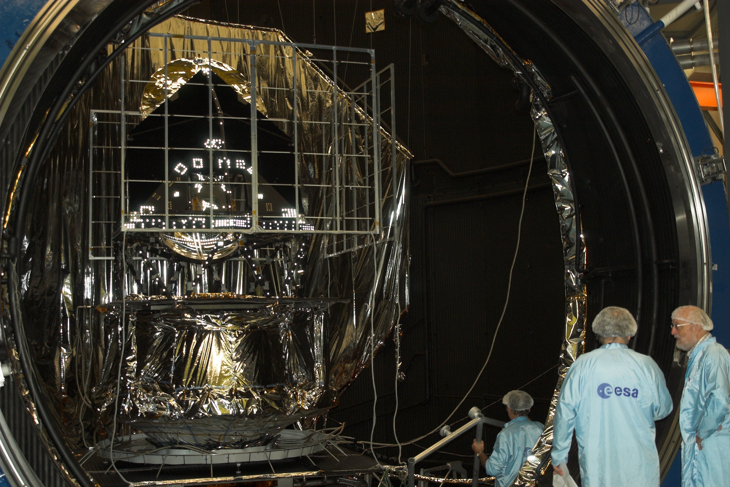 Date: 03 August 2006 Satellite: Planck Depicts: Flight model of Planck telescope inside the LSS Location: Large Space Simulator, ESTEC, Noordwijk Copyright: ESA Show in archive: true