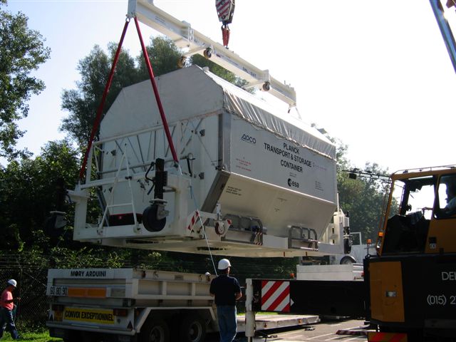 The Planck FM telescope, housed in the Planck Spacecraft Container, is loaded onto a truck at ESTEC to be transported to the premises of Planck prime contractor Alcatel Alenia Space France in Cannes, France.