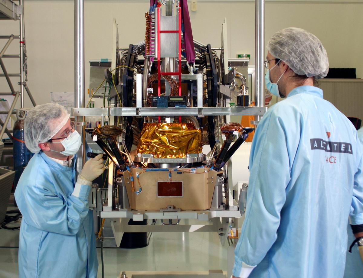 Top view of the focal plane assemblies of the two Planck instruments HFI and LFI during integration, with the focal plane box facing down.