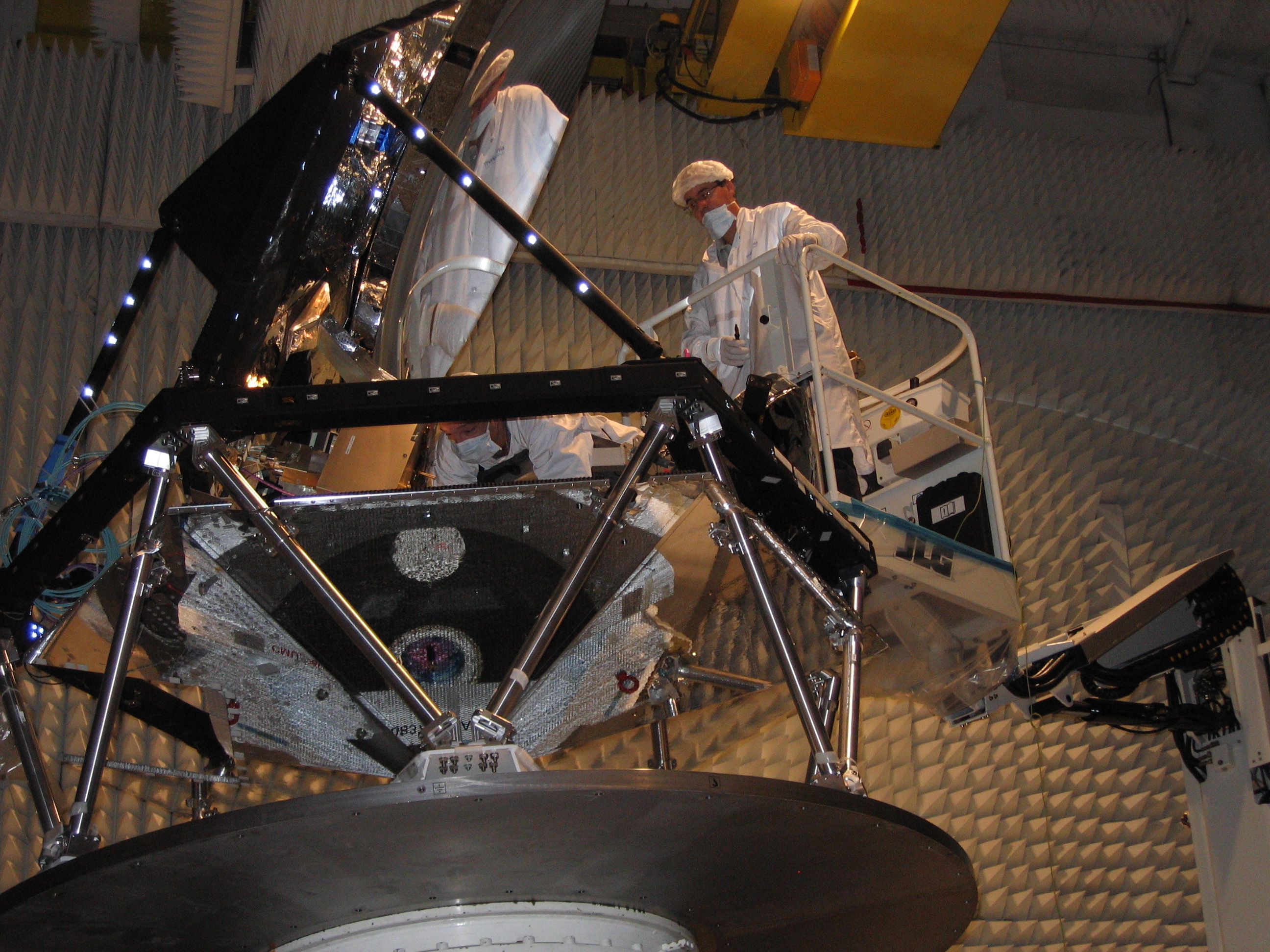 Two members of the Thales team changing a shim behind the RF test horn in the focal plane of the Radio Frequency Qualification Model (RFQM) of the Planck telescope.