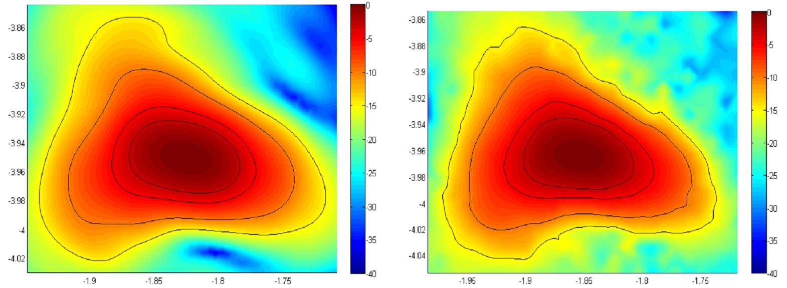 Out of focus beam pattern at 320 GHz of the Planck RFQM telescope, with an 8mm shim behind the test horn. Left: prediction, right: measurement. The normalised signal level is colour coded in dB (same scale for both plots) and iso-contours are shown for 3, 5, 10 and 15 dB below peak.