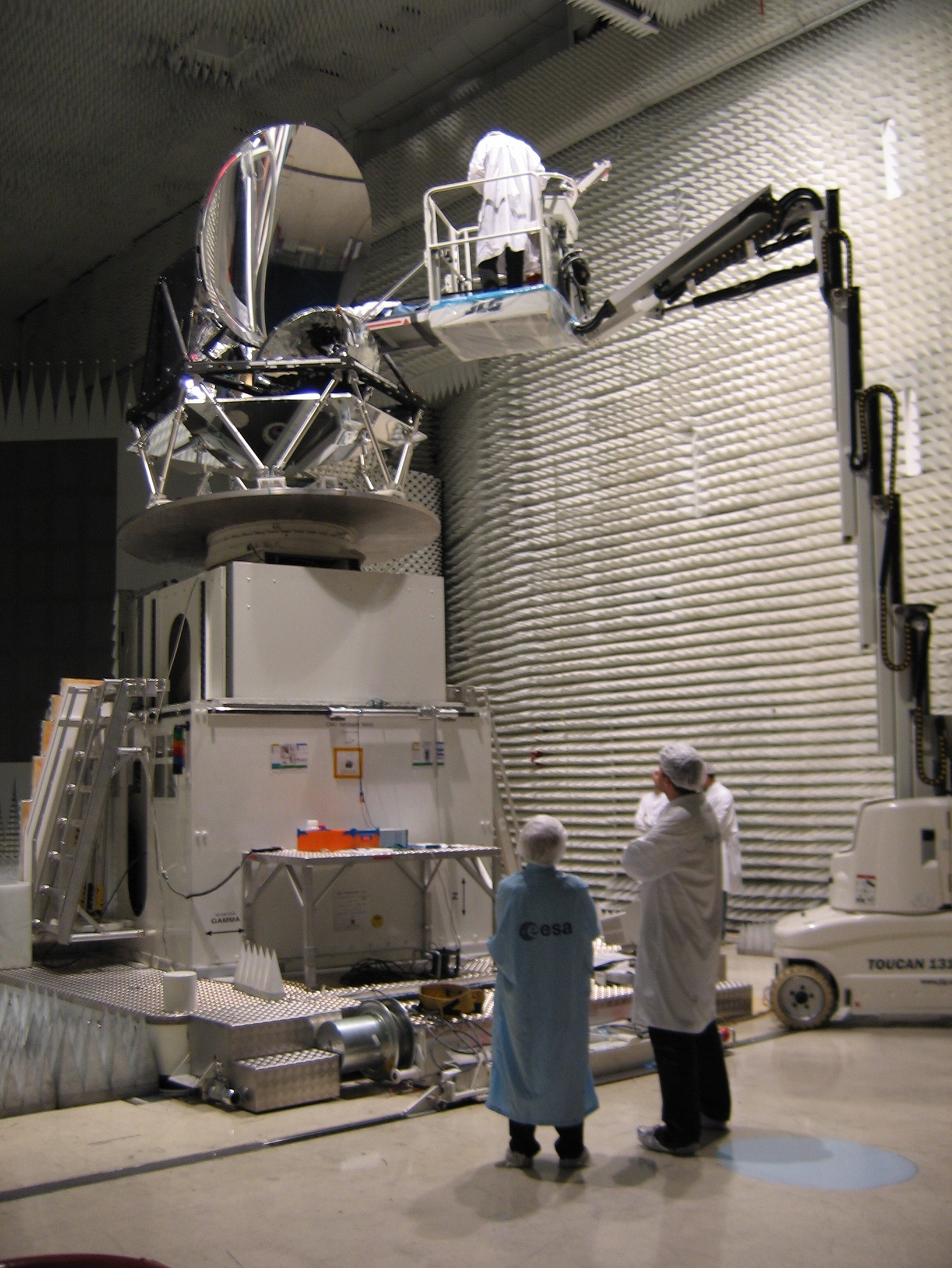 The Planck Radio Frequency Qualification Model (RFQM) telescope inside the Thales Alenia Space CATR, during shim change operations of the RF test horn.
