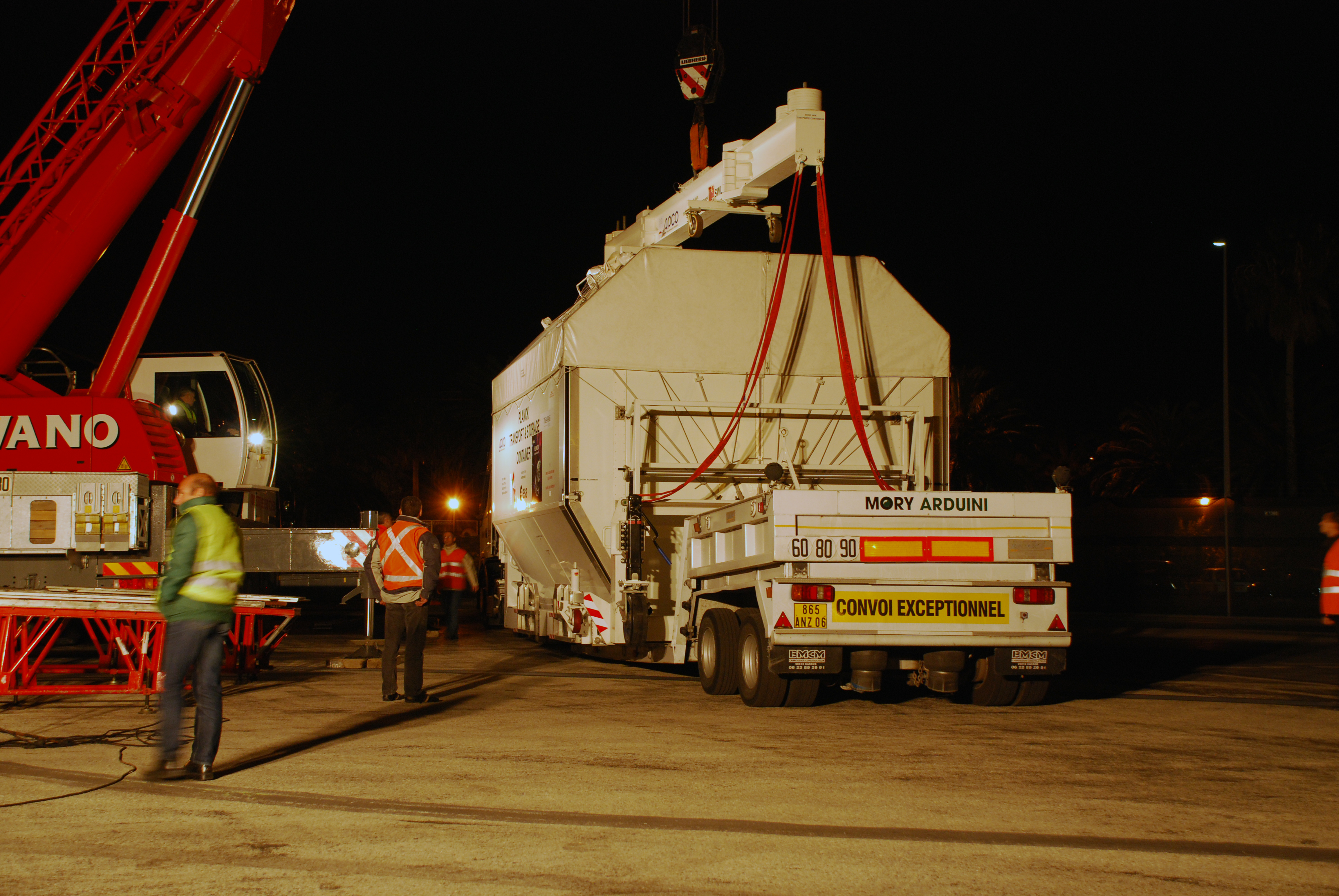 The Planck transport & storage container is hoisted of the transporter truck at the airport in Nice for loading on to the Antonov 124 cargo aircraft that takes it to Amsterdam airport. From there the container with the Planck flight model spacecraft is transported by truck to ESTEC, Noordwijk, where the spacecraft will undergo fine balance testing inside the Large Space Simulator (LSS).