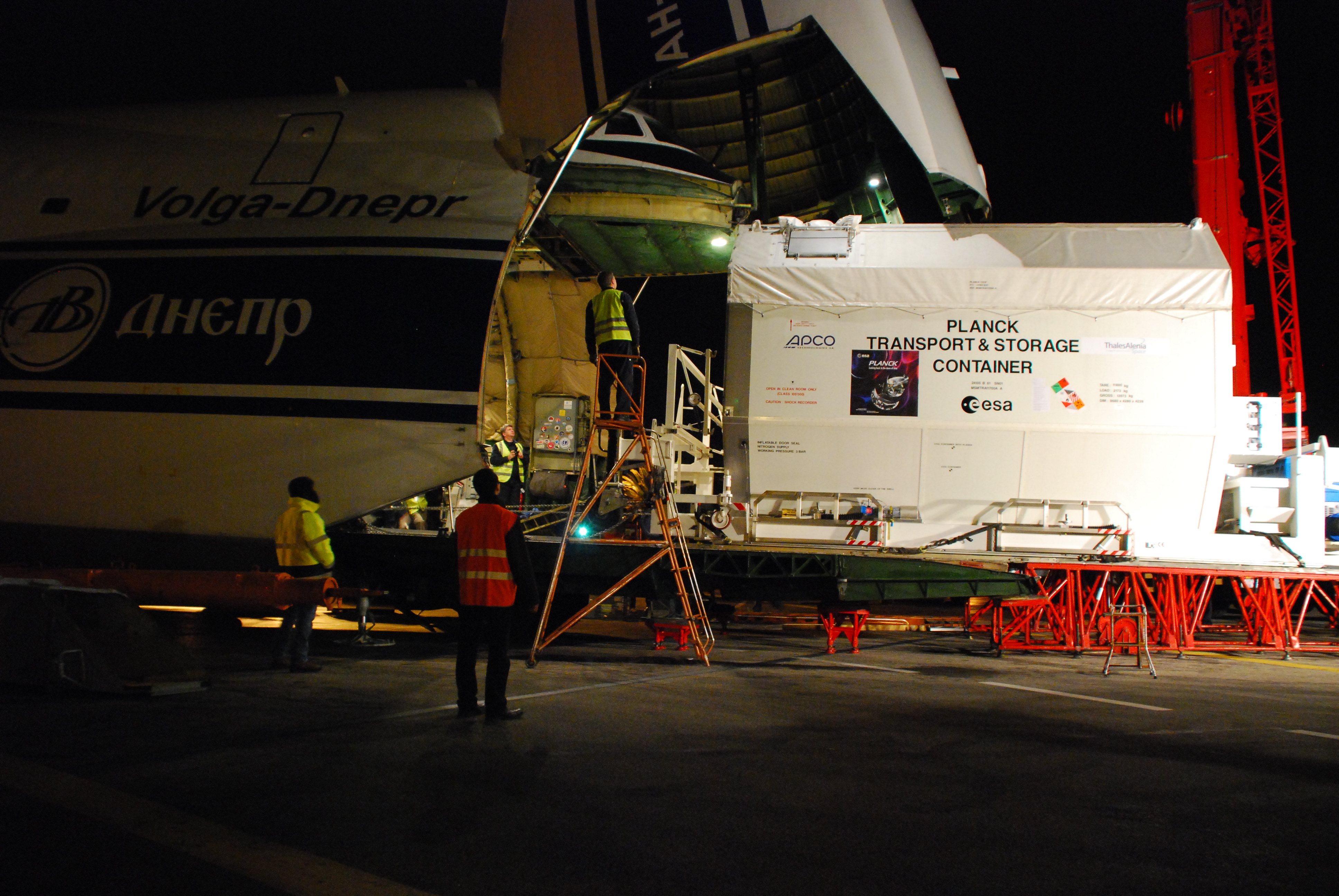 The Planck transport & storage container is being loaded on to the Antonov 124 cargo aircraft that takes it to Amsterdam airport. From there the container with the Planck flight model spacecraft is transported by truck to ESTEC, Noordwijk, where the spacecraft will undergo fine balance testing inside the Large Space Simulator (LSS)