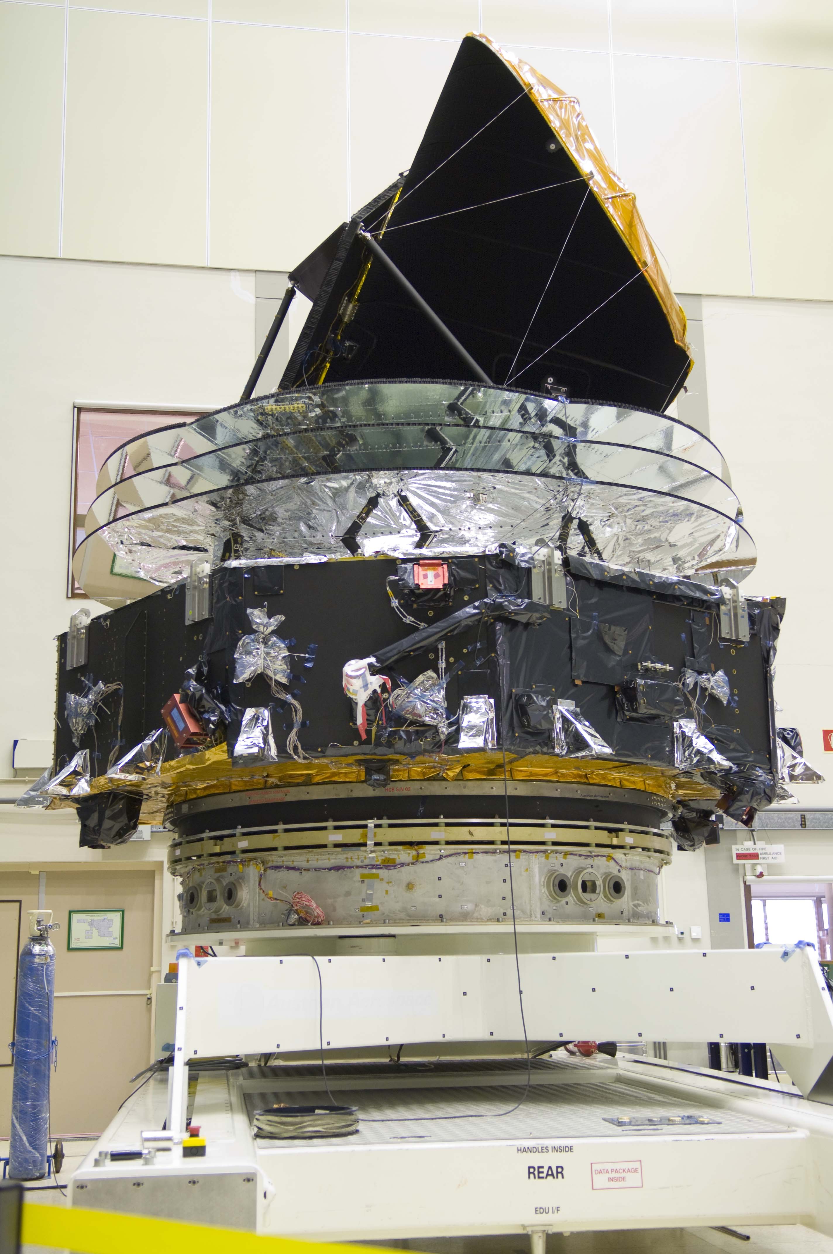 The Planck flight model arrived at the ESTEC test facilities in the night of 27-28 March. The spacecraft is seen here on the multi purpose trolley inside the ESTEC cleanrooms where it is being prepaired for a fine balancing test inside the Large Space Simulator.