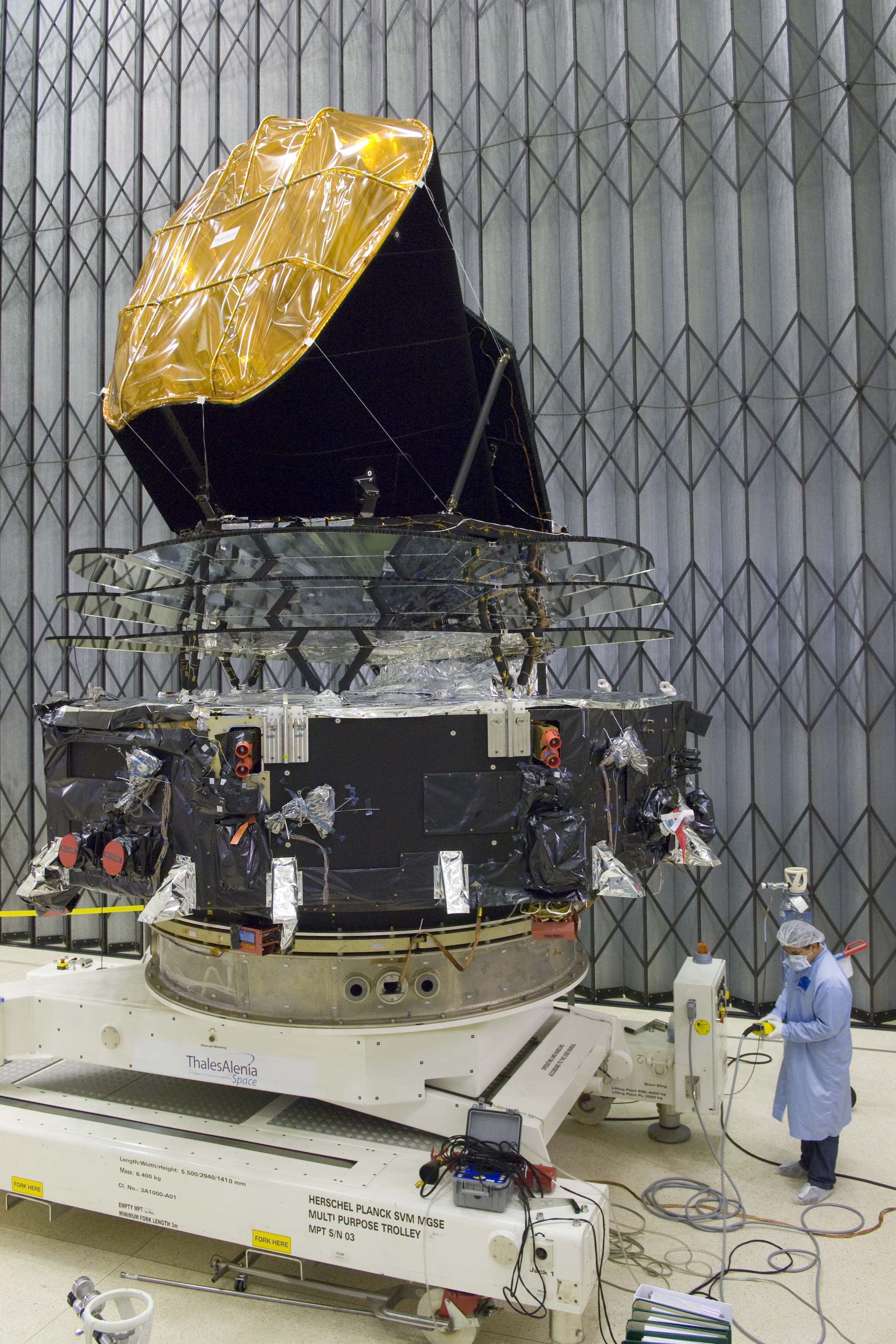 The Planck flight model arrived at the ESTEC test facilities in the night of 27-28 March. The spacecraft is seen here on the multi purpose trolley inside the ESTEC cleanrooms where it is being prepaired for a fine balancing test inside the Large Space Simulator.