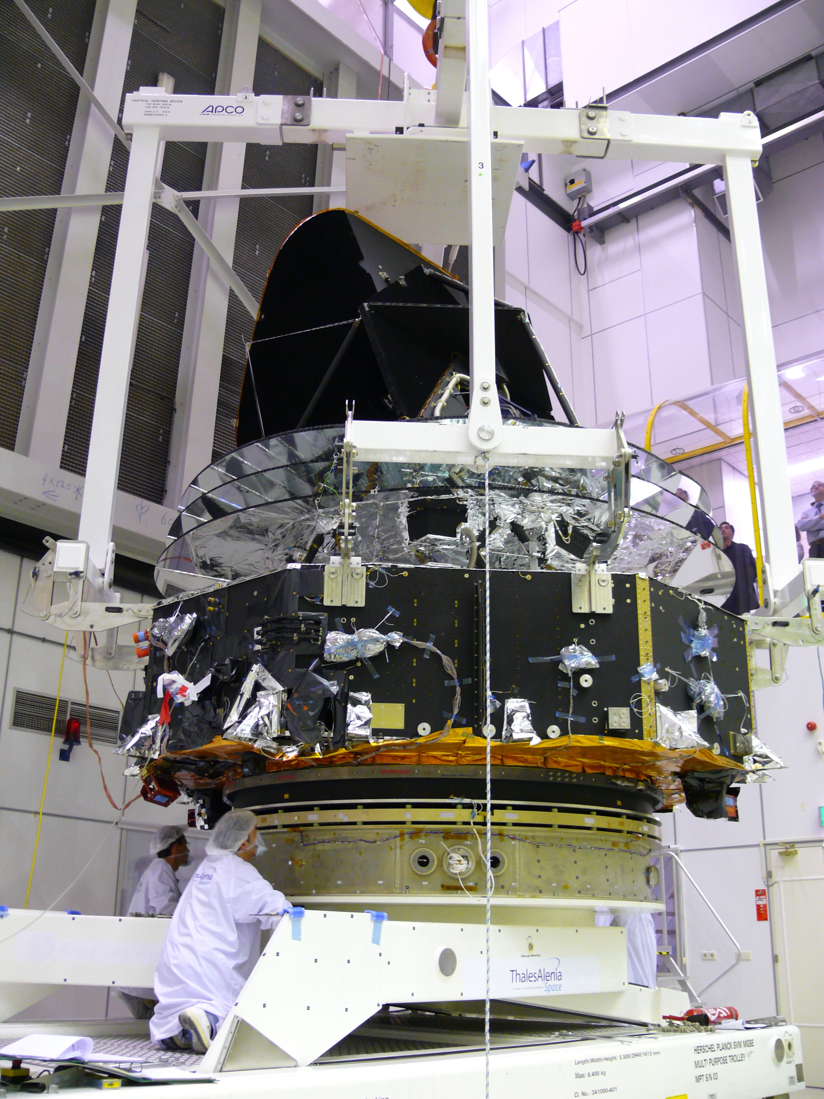 Wednesday, 2 April, the Planck spacecraft was transferred to the Large Space Simulator (LSS) at ESTEC. This view shows the spacecraft still resting on its ground support equipment (GSE), but with the overhead crane attached to it and ready for lifting the spacecraft up to the entrance level of the LSS.