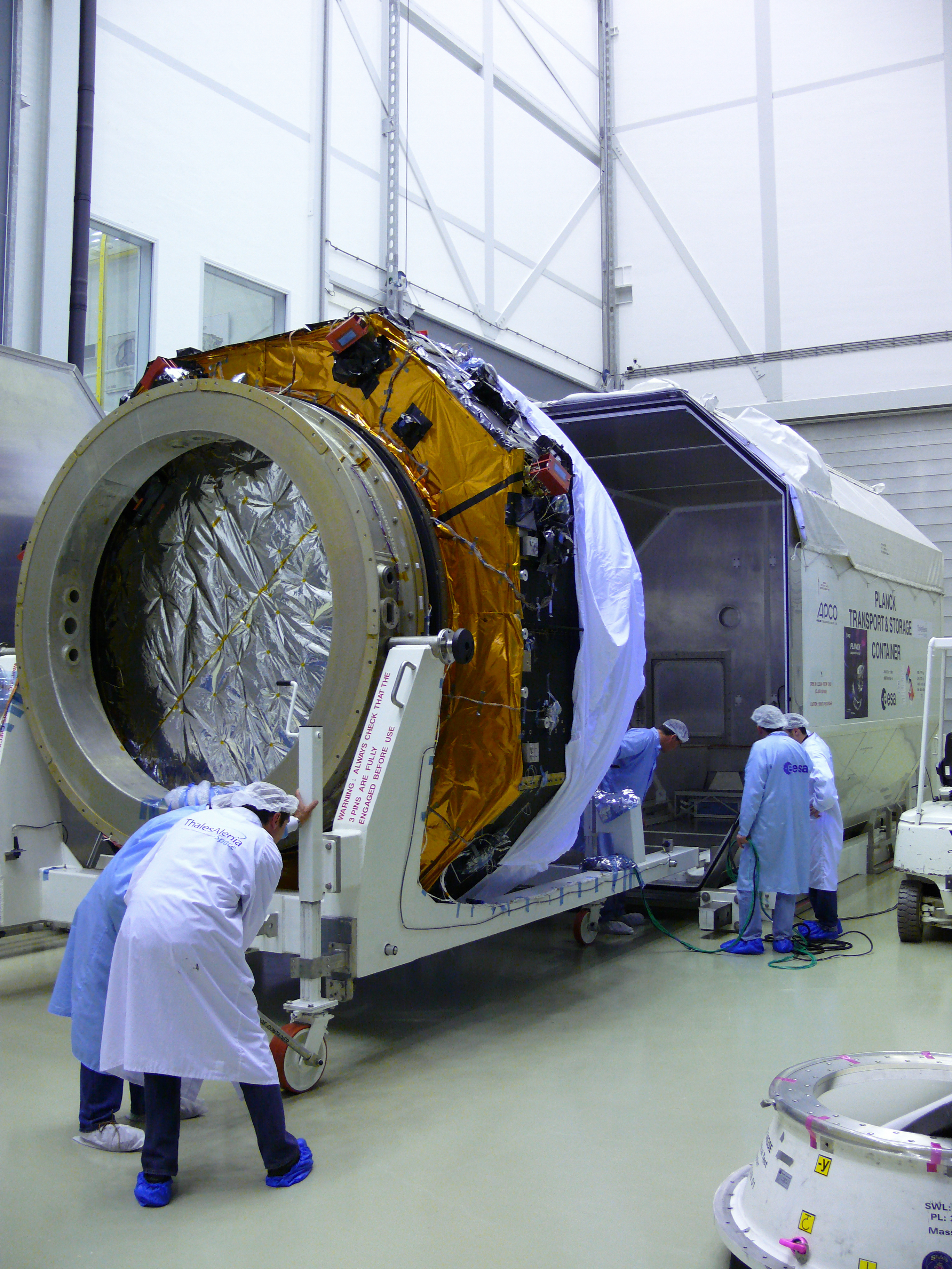 Monday, 21 April 2008, the Planck spacecraft was rolled into its transport and storage container for transport to Centre Spatial Liège.