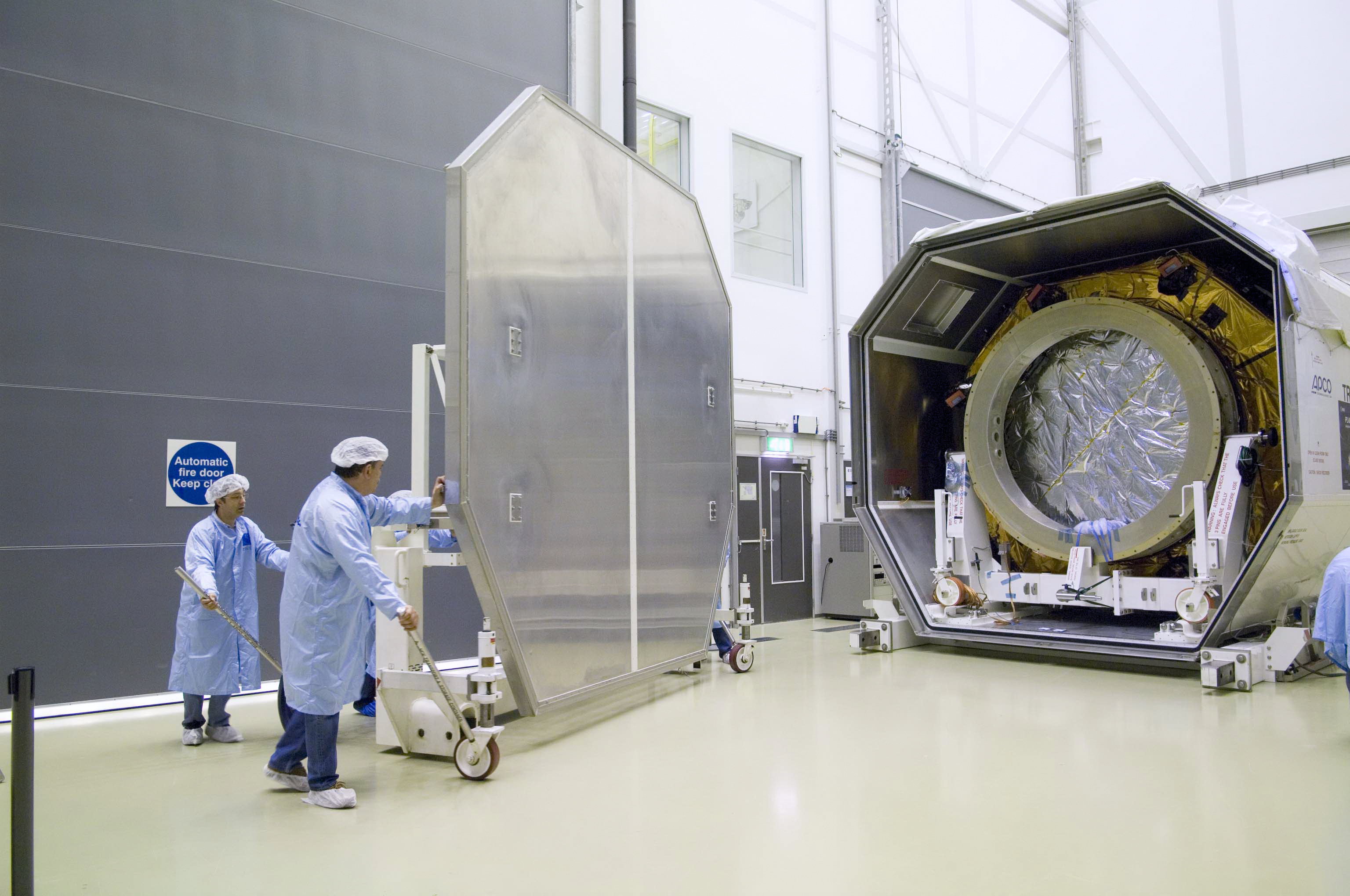 Date: 21 April 2008 Satellite: Planck Depicts: Spacecraft in transport and storage container Location: Cleanroom at ESTEC, Noordwijk, The Netherlands Copyright: ESA Show in archive: true