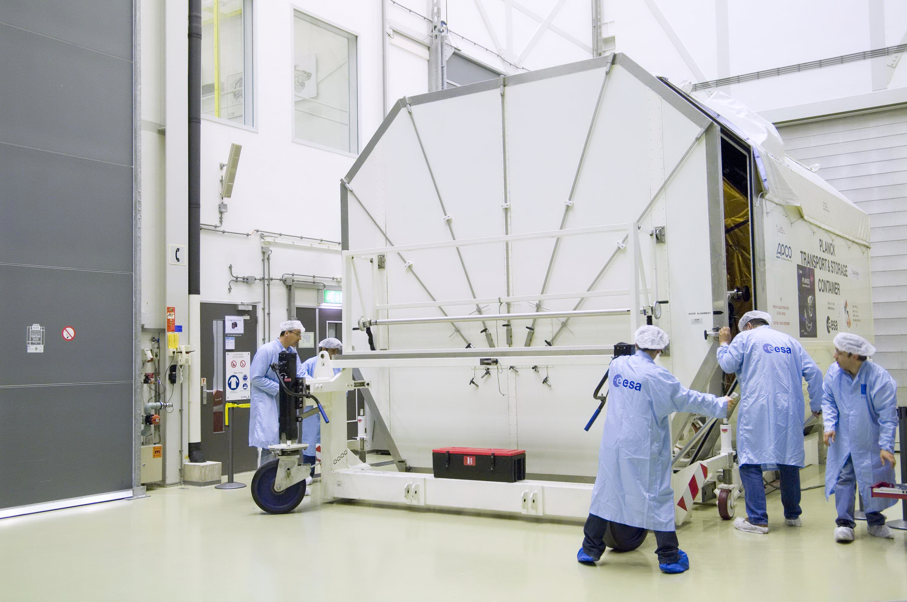Date: 21 April 2008 Satellite: Planck Depicts: Spacecraft in transport and storage container Location: Cleanroom at ESTEC, Noordwijk, The Netherlands Copyright: ESA Show in archive: true