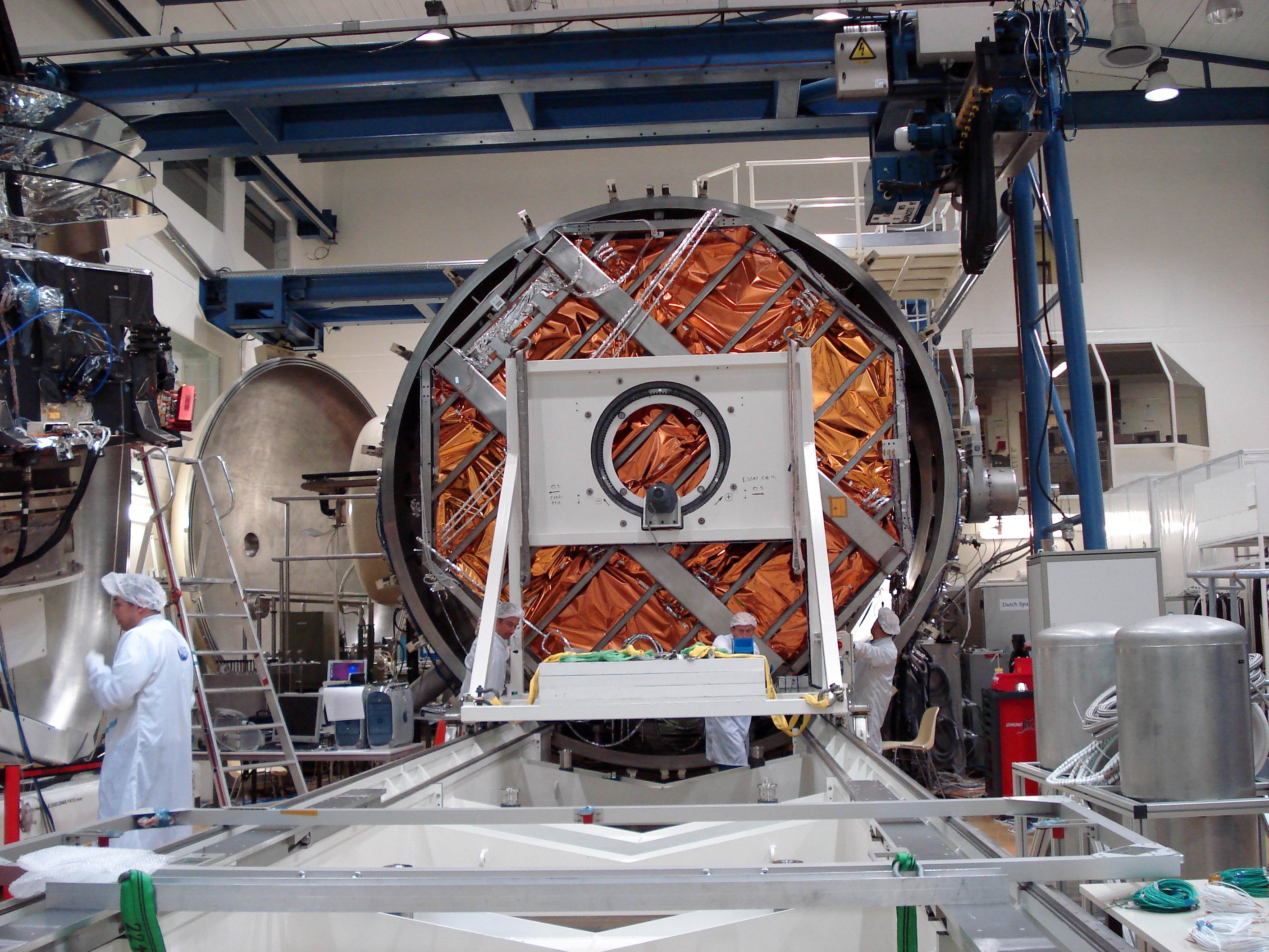 The Planck spacecraft is just visible on the left, where it stands on the multi purpose trolley. For the TBTV test, the spacecraft will be positioned horizontally in which position it fits inside the thermal tent of the test chamber. The closing lid of the vacuum chamber stands against the wall in the background on the left.