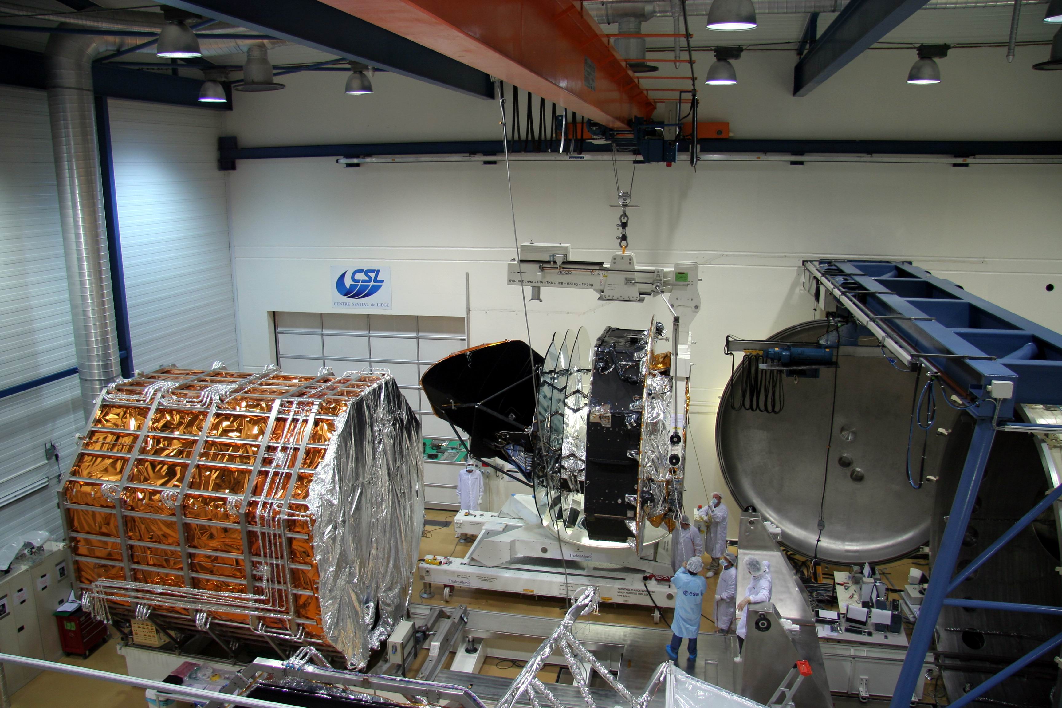 By means of an overhead crane the Planck spacecraft is hoisted from its ground support to be placed on the "CSL Square Support" on which the spacecraft will be fastened for placing inside the FOCAL-5 test chamber.
