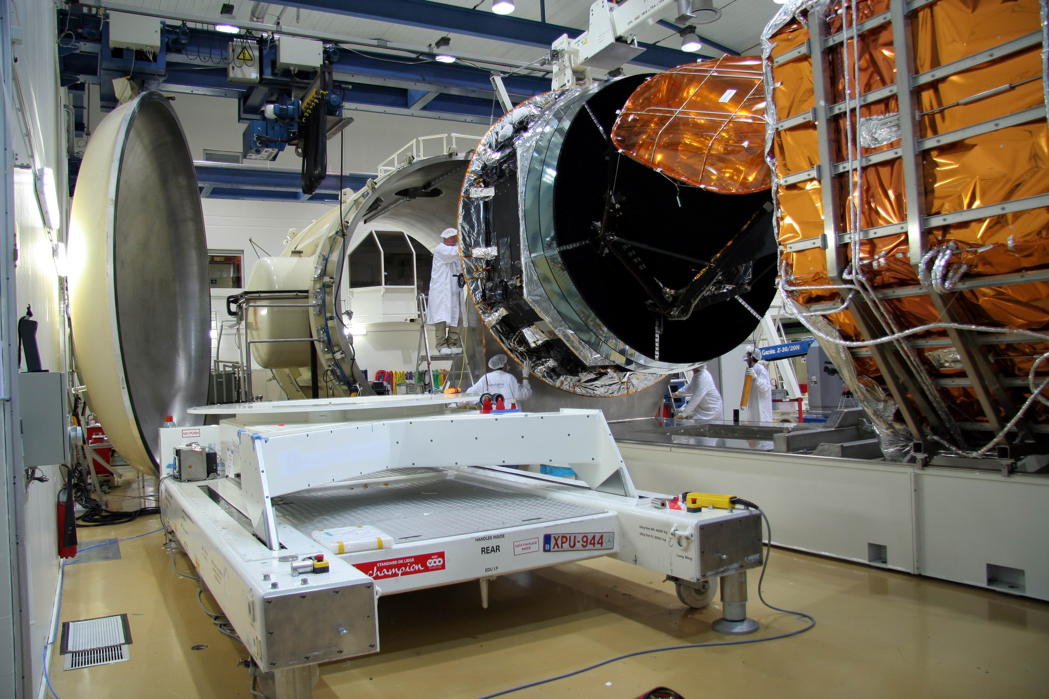 View of the Planck spacecraft during the preparations for the chamber fit check on 19 May 2008. The cylindrical FOCAL-5 test chamber is seen in the background and the thermal tent that will surround the spacecraft inside the FOCAL-5 test chamber is seen on the right.