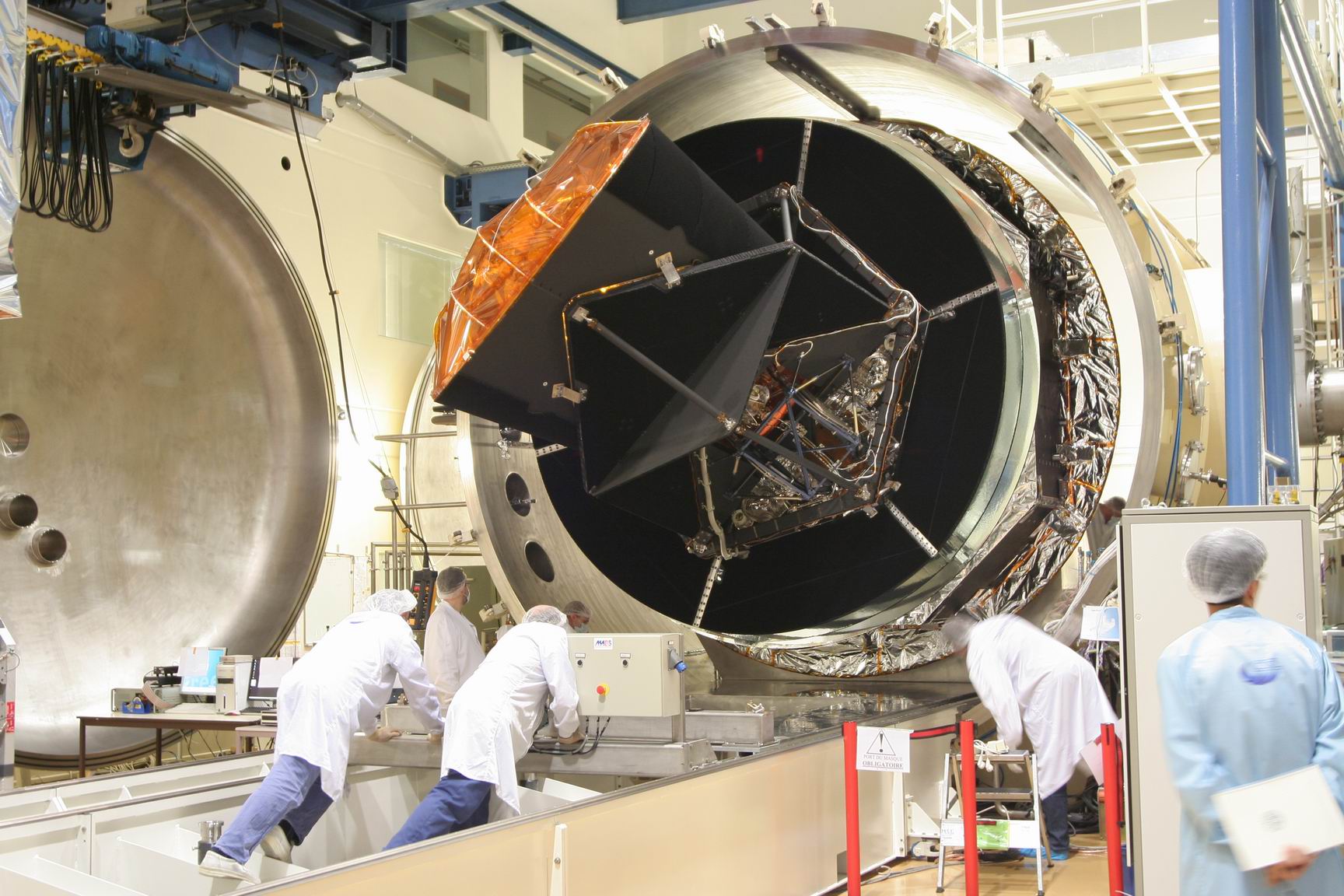 Secured in a horizontal position the Planck spacecraft is pushed into the FOCAL-5 vacuum chamber for Phase 1 of the thermal balance / thermal vacuum test campaign at CSL.