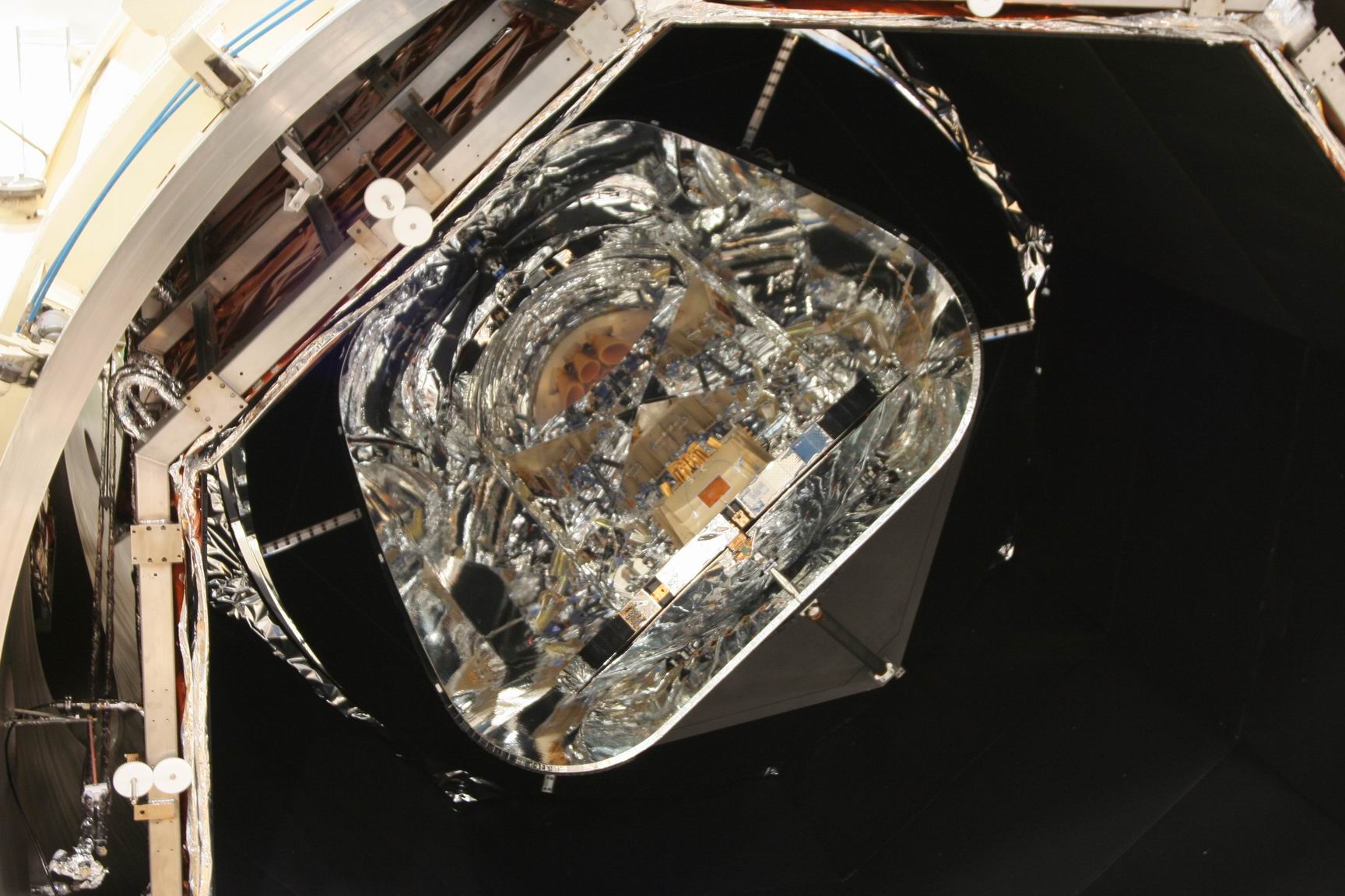 View of the Planck telescope and focal plane unit, with the spacecraft in a horizontal position inside the FOCAL-5 vacuum chamber.