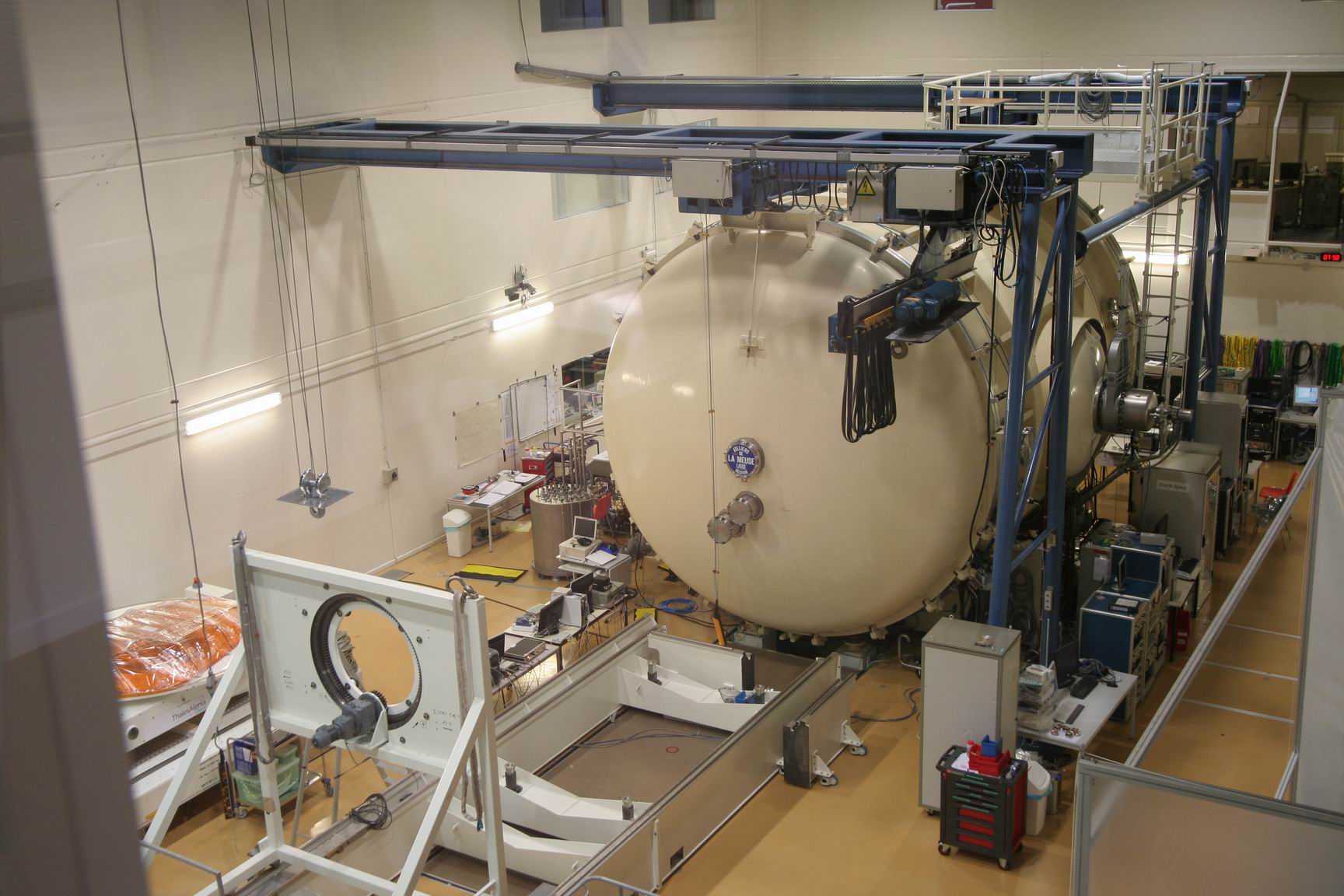 View of the FOCAL-5 vacuum chamber prior to the start of the thermal balance / thermal vacuum (TBTV) test campaign, containing the Planck spacecraft.
