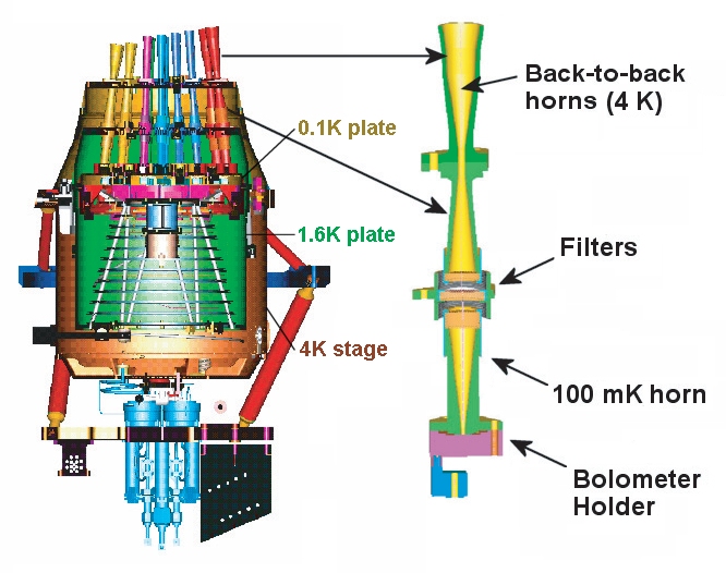 This cut-away view of the High Frequency Instrument (HFI) focal plane unit (FPU) shows the location of the different temperature stages within the FPU. The HFI bolometers require an operational temperature of 0.1 K to be able to reach the required detector efficiency.