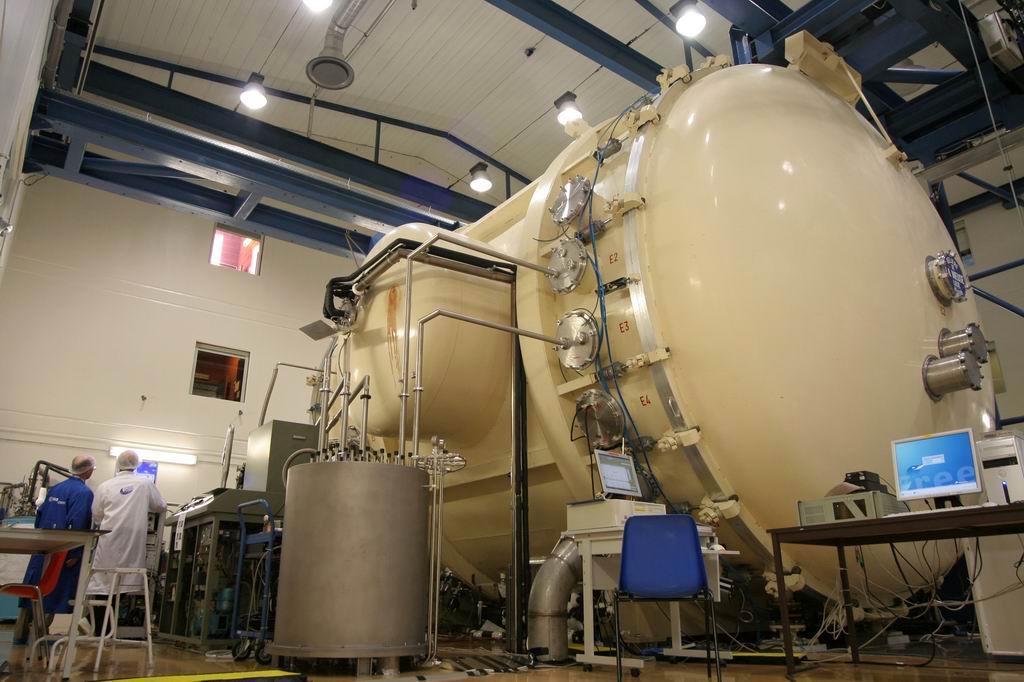 View of the FOCAL-5 test chamber at Centre Spatiale de Liège (CSL), during the thermal balance and thermal vacuum (TBTV) test campaign for the Planck flight model spacecraft.