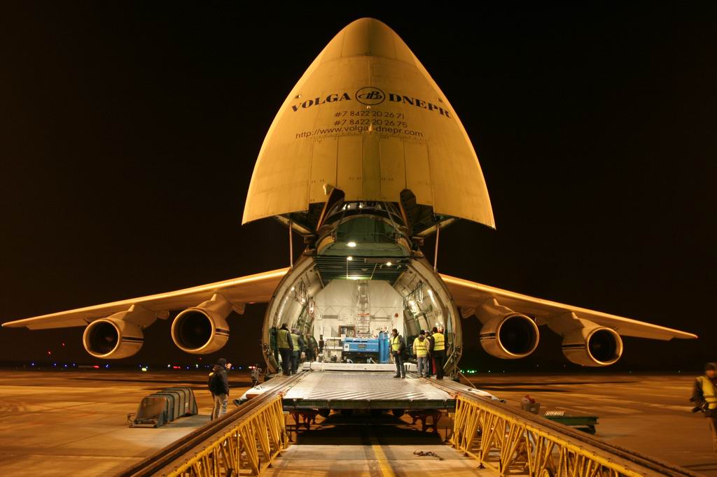 At the Liège airport the custom container carrying the Planck spacecraft is in place inside the large Antonov cargo plane, seen here with its nose still open (around 2 A.M.). Later Planck was flown to Rochambeau airport, French Guiana, with one intermediate stop in Cape Verde for additional re-fuelling of the airplane.