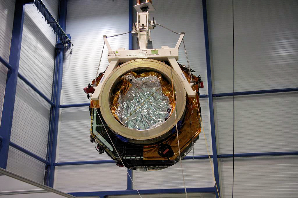 The Planck spacecraft is hoisted up inside the FOCAL-X cleanroom at Centre Spatial de Liège (CSL) during the transfer to the multi-purpose trolley. This view shows the base of the spacecraft's service module, with the qualification model (QM) of the inner part of the solar array still in place (silver). Later this month, after removing the QM solar array, the flight model solar array will be integrated with the spacecraft.