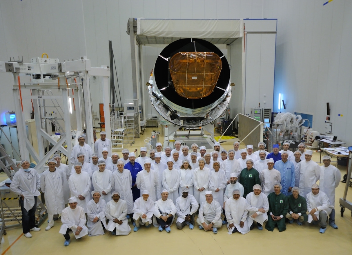 Date: 05 March 2009 Satellite: Planck Depicts: Launch campaign team in front of the flight model spacecraft Location: Cleanroom of S1B building, CSG, Kourou, French Guiana Copyright: ESA Show in archive: true