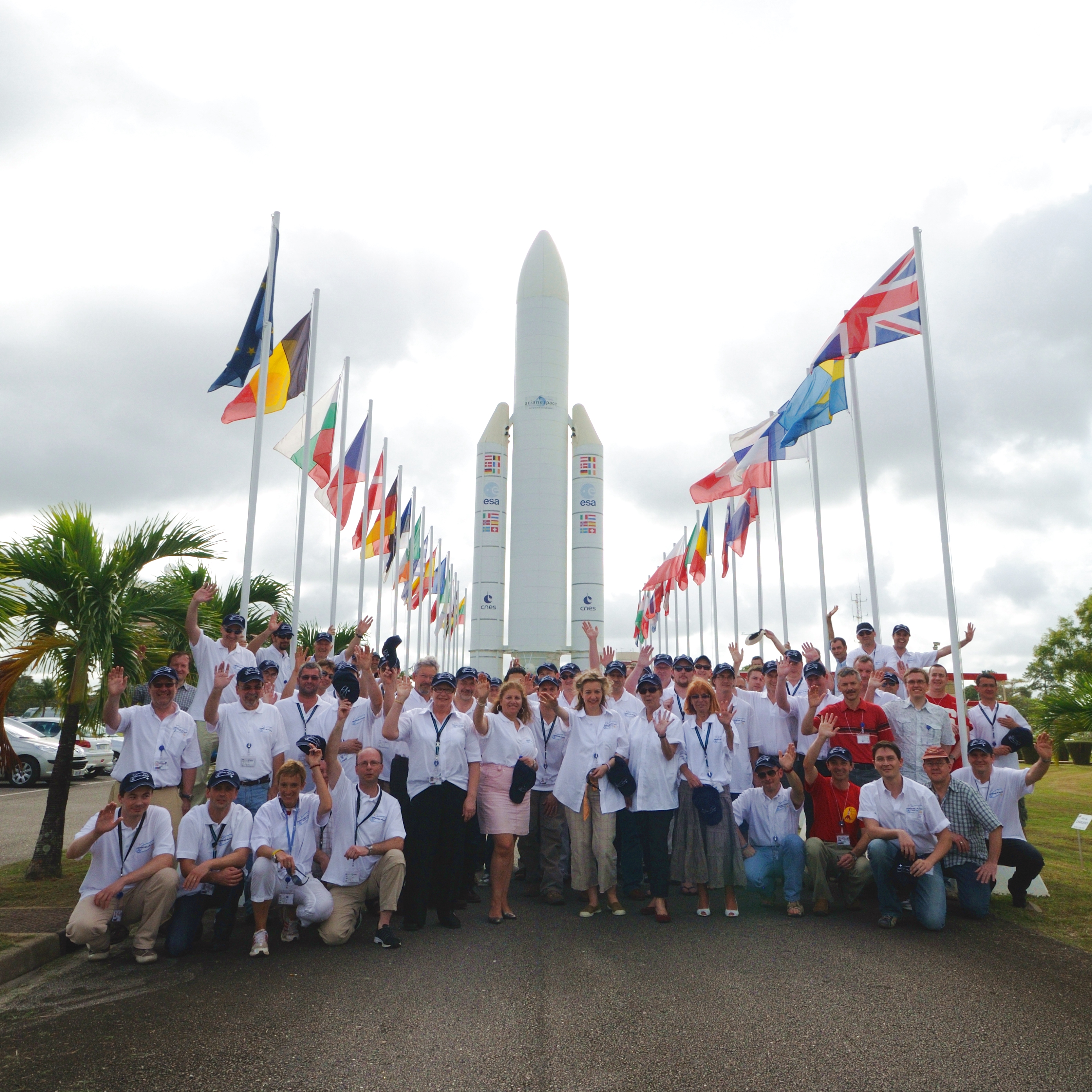 Depicts: Launch campaign teams in front of an Ariane 5 model rocket
