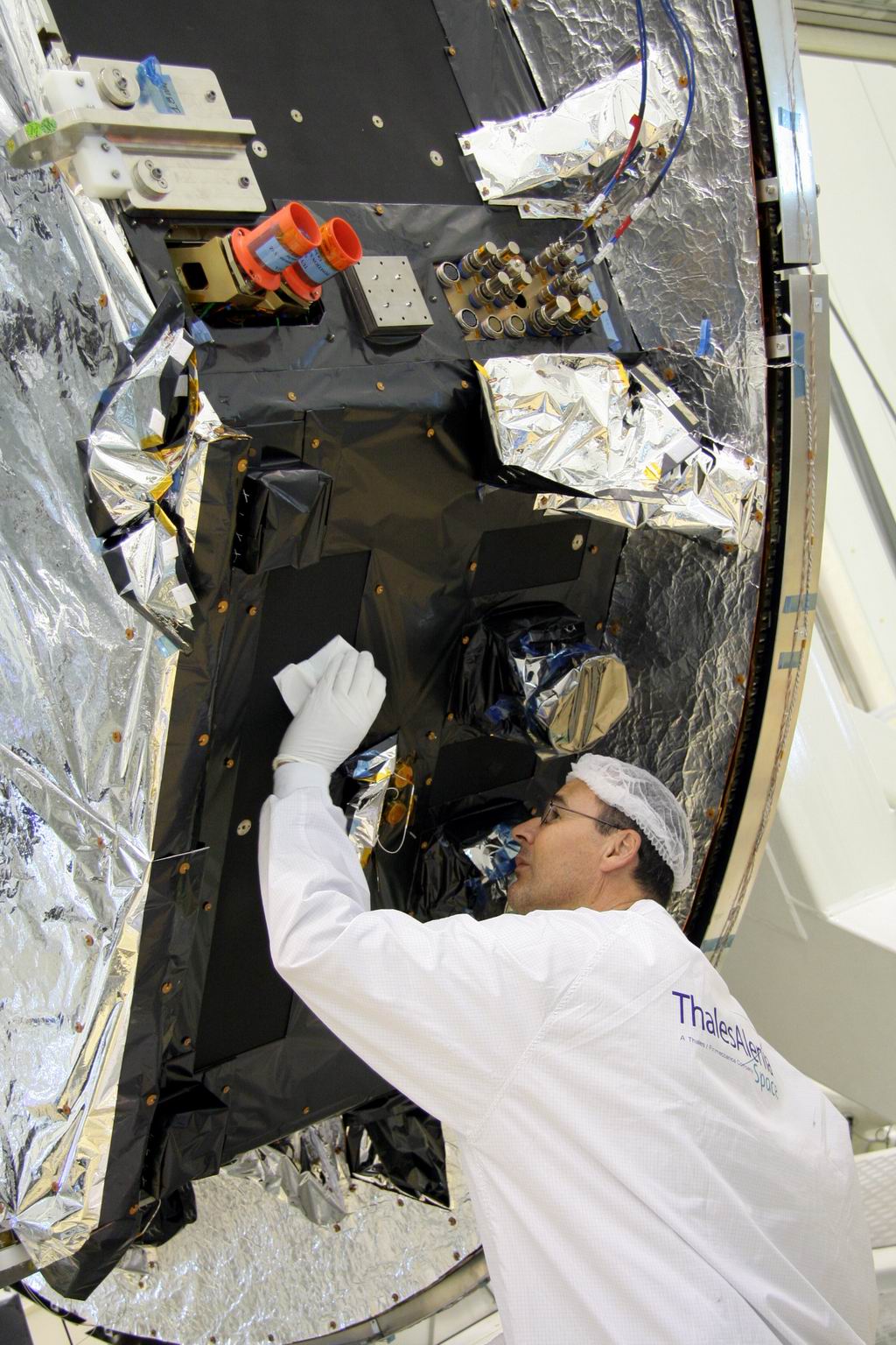 Date: 14 April 2009 Satellite: Planck Depicts: Cleaning of a side panel on the service module Location: S1B cleanroom, CSG, Kourou, French Guiana Copyright: ESA Show in archive: true