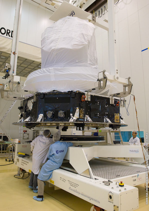Planck is lifted from the multi-purpose trolley. A white textile cover is protecting the telescope and V-grooves.