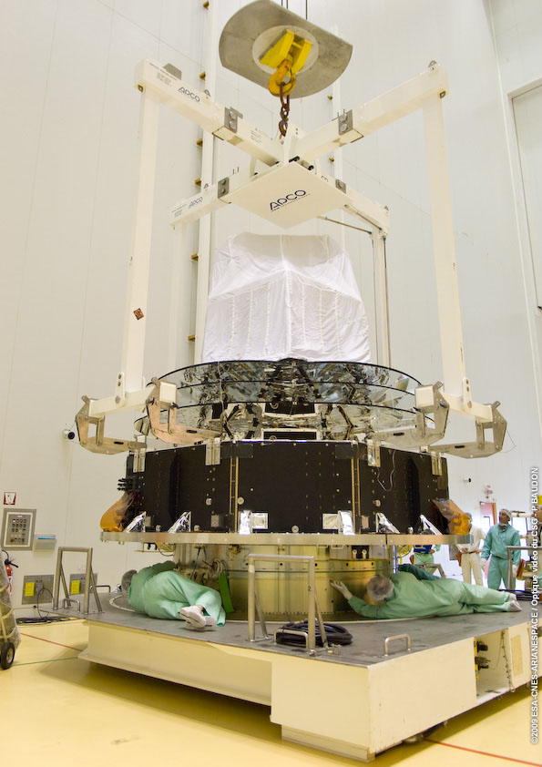 Next the Planck spacecraft with the launcher adapter ring was lifted up inside the BAF for mating of the spacecraft on top of the Ariane 5 ECA launcher.