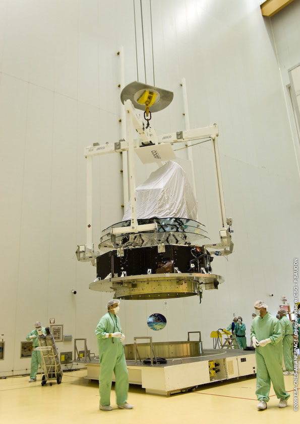 The Planck spacecraft, with the launcher adapter ring integrated to the base of its service module, is lifted up inside the final assembly building (Bâtiment d'Assemblage Final, or BAF) for mating of the spacecraft on top of the Ariane 5 ECA launcher in the adjacent high hall.