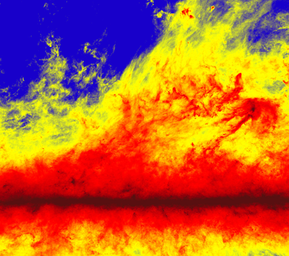 This Planck image, covering a portion of the sky about 55 degrees in total extent, was obtained by the Planck High Frequency Instrument at a frequency of 857 GHz (corresponding to a wavelength of 350 micrometres). The bright horizontal band corresponds to the plane of our spiral Galaxy, which is seen in cross-section from our vantage point. The colours in the Planck image represent the intensity of heat radiation by dust.