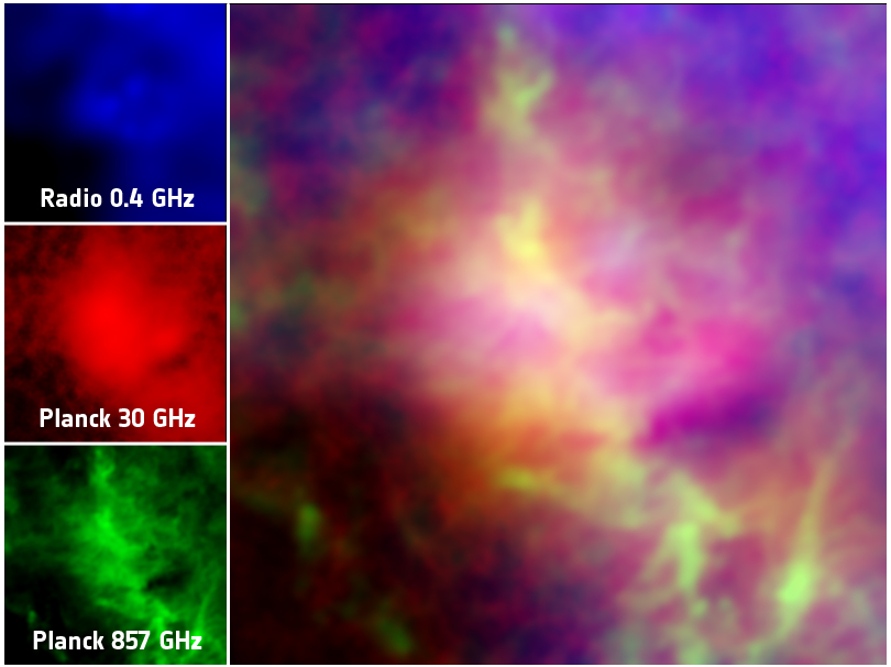 This three-colour composite image of the Perseus molecular cloud (displayed on the right) is based on the three individual maps (shown on the left) of the complex, taken at 0.4 GHz from Haslam et al. (1982) and at 30 and 857 GHz by Planck, respectively. The colour composite highlights the correlation between the anomalous microwave emission, most likely due to nano-sized spinning dust grains and observed at 30 GHz (shown here in red) and the thermal dust emission, observed at 857 GHz (shown here in green). The complex structure of knots and filaments visible in this cloud of gas and dust represents striking evidence for on-going processes of star formation.