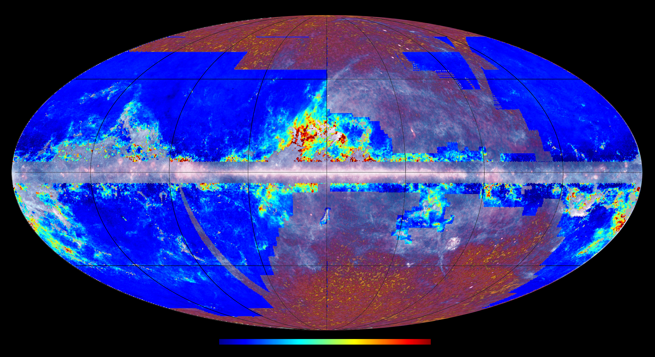 The distribution of the excess emission is represented in terms of an excess in the measured column density and is mapped as a gradient according to the colour bar plotted below the figure, which covers the range (from left to right) -0.5 to 3.0 x 1021 H/cm2. It is shown superimposed on top of the all-sky image from Planck's first survey, which highlights the two major emission sources in the microwave sky: the cosmic background and the Milky Way.