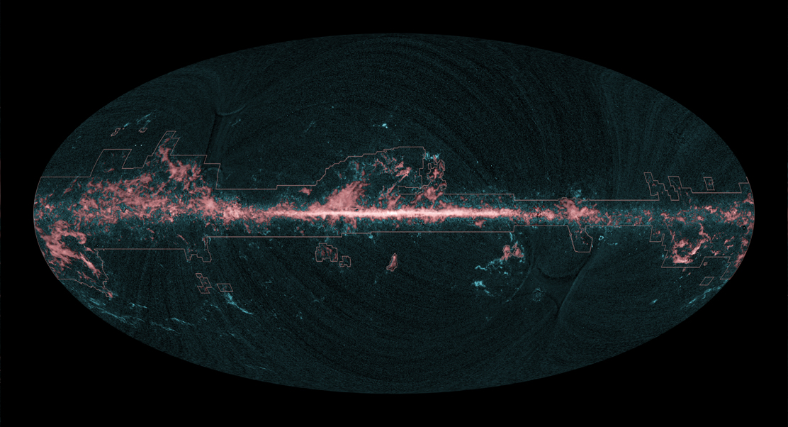 This all-sky image shows the distribution of carbon monoxide (CO), a molecule used by astronomers to trace molecular clouds across the sky, as seen by Planck (blue). A compilation of previous surveys (Dame et al. (2001)), which left large areas of the sky unobserved, has been superimposed for comparison (red). The outlines identify the portions of the sky covered by these surveys.