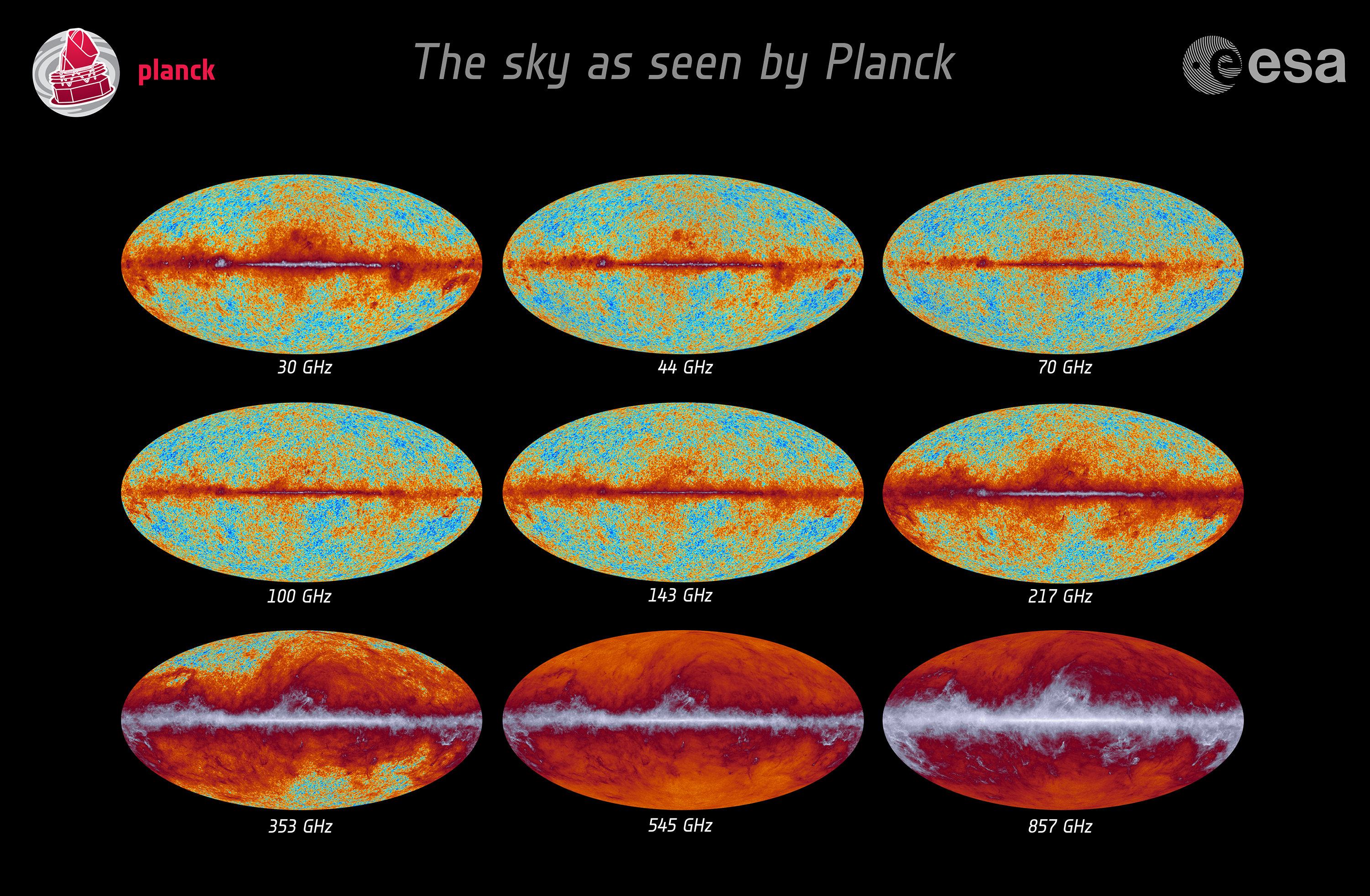 This image shows the all-sky maps recorded by Planck at nine frequencies during its first 15.5 months of observations. These were collected using the two instruments on board Planck: the Low Frequency Instrument (LFI), which probes the frequency bands between 30 and 70 GHz, and the High Frequency Instrument (HFI), which probes the frequency bands between 100 and 857 GHz.