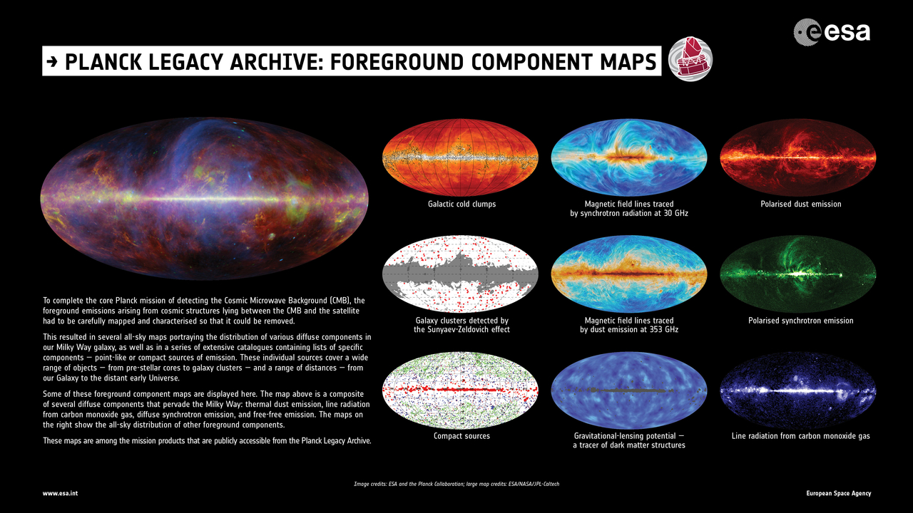 This infographic shows some of the maps that are publicly accessible from the Planck Legacy Archive.