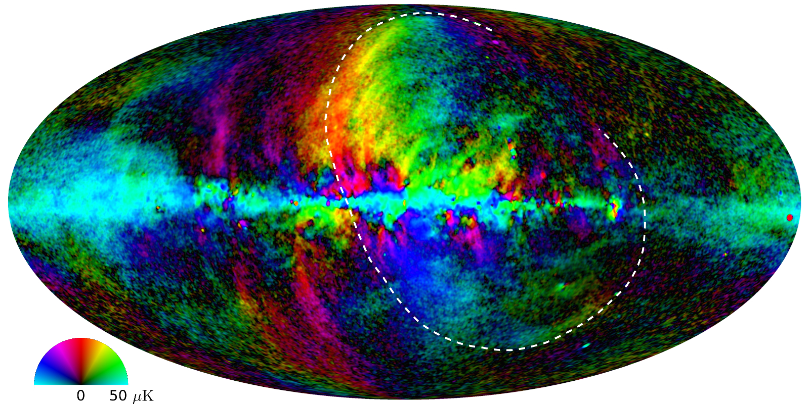(A version of the image without the position of Loop I is available here. The colour represents the direction of polarisation, while the brightness of the colour measures the intensity of polarisation.)