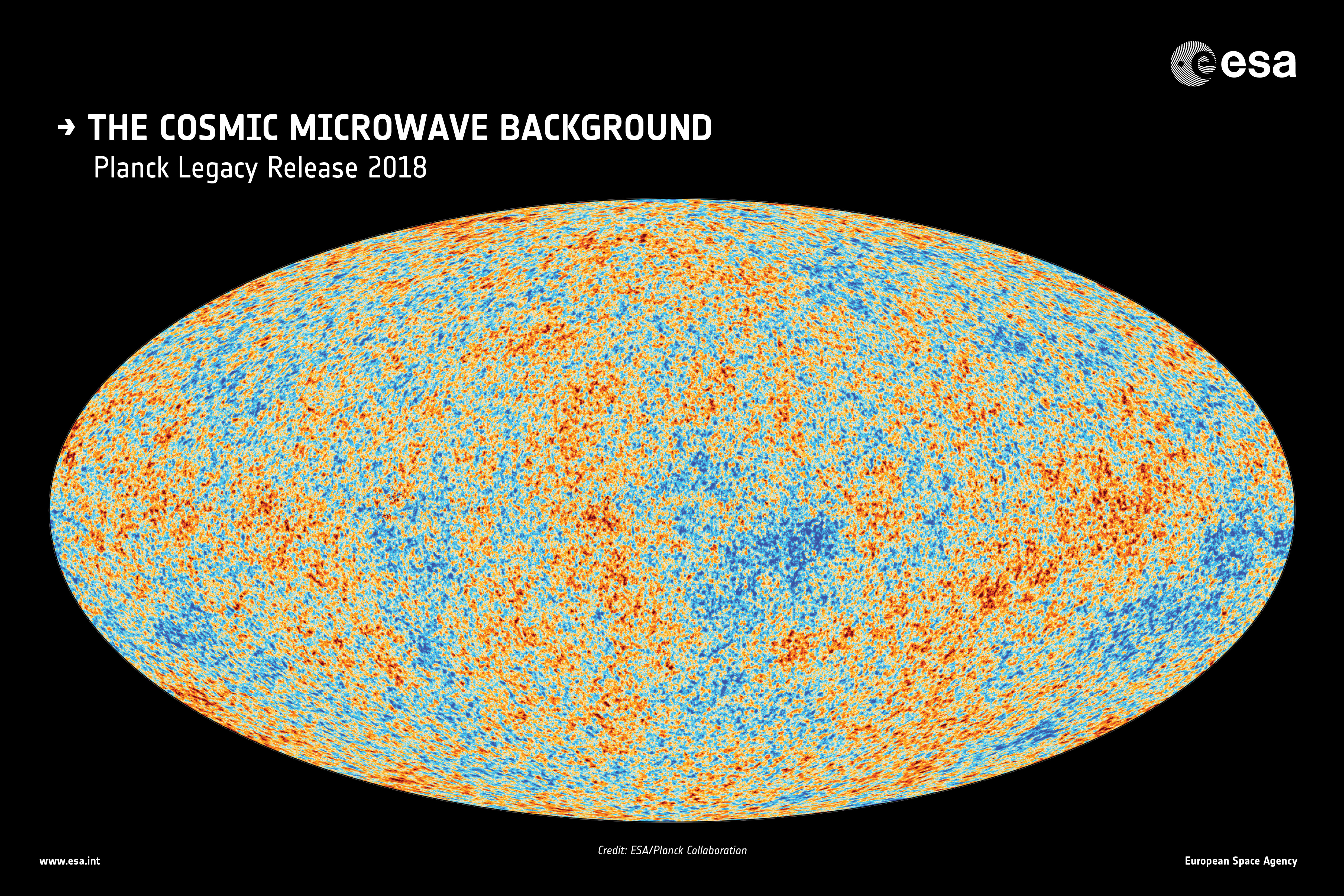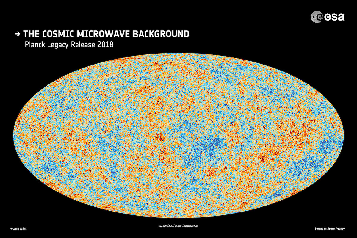 The anisotropies of the cosmic microwave background, or CMB, as observed by ESA's Planck mission.