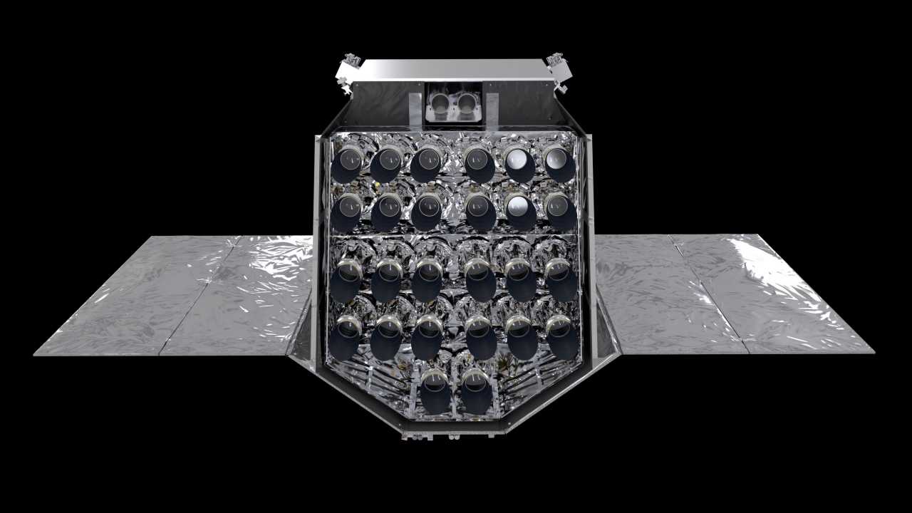 Artist's impression of ESA's PLATO spacecraft. This top view highlights the unique payload that comprises 26 cameras. Two smaller cameras, seen at top in this image, are not part of the payload, but rather startrackers used for navigation.