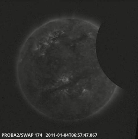 Proba-2's SWAP imager had its view of the 4 January 2010 solar eclipse dimmed by the approaching Earth's atmosphere, which blocks much of the EUV light the instrument is sensitive to. At this point Proba-2, the Earth, Moon and Sun are near the same line in space.