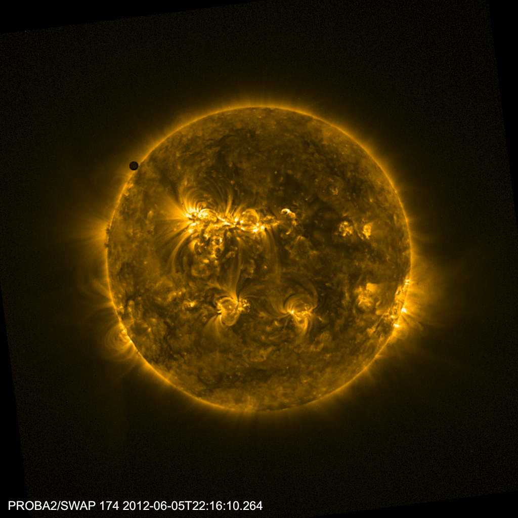 In this image, taken near the start of the transit of Venus across the Sun's disk, SWAP sees Venus as a small, black circle, obscuring the extreme-ultraviolet light emitted from the solar atmosphere.