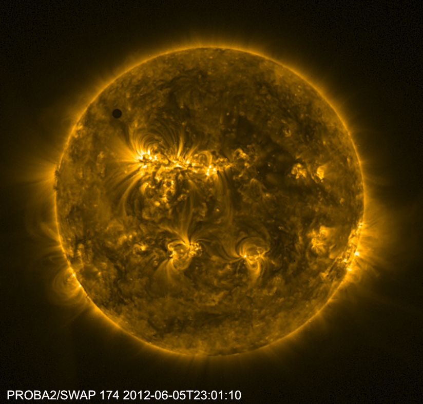 This image of the solar transit of Venus in the night of 5-6 June 2012 was obtained with SWAP, the extreme-ultraviolet telescope onboard ESA's PROBA-2 microsatellite.