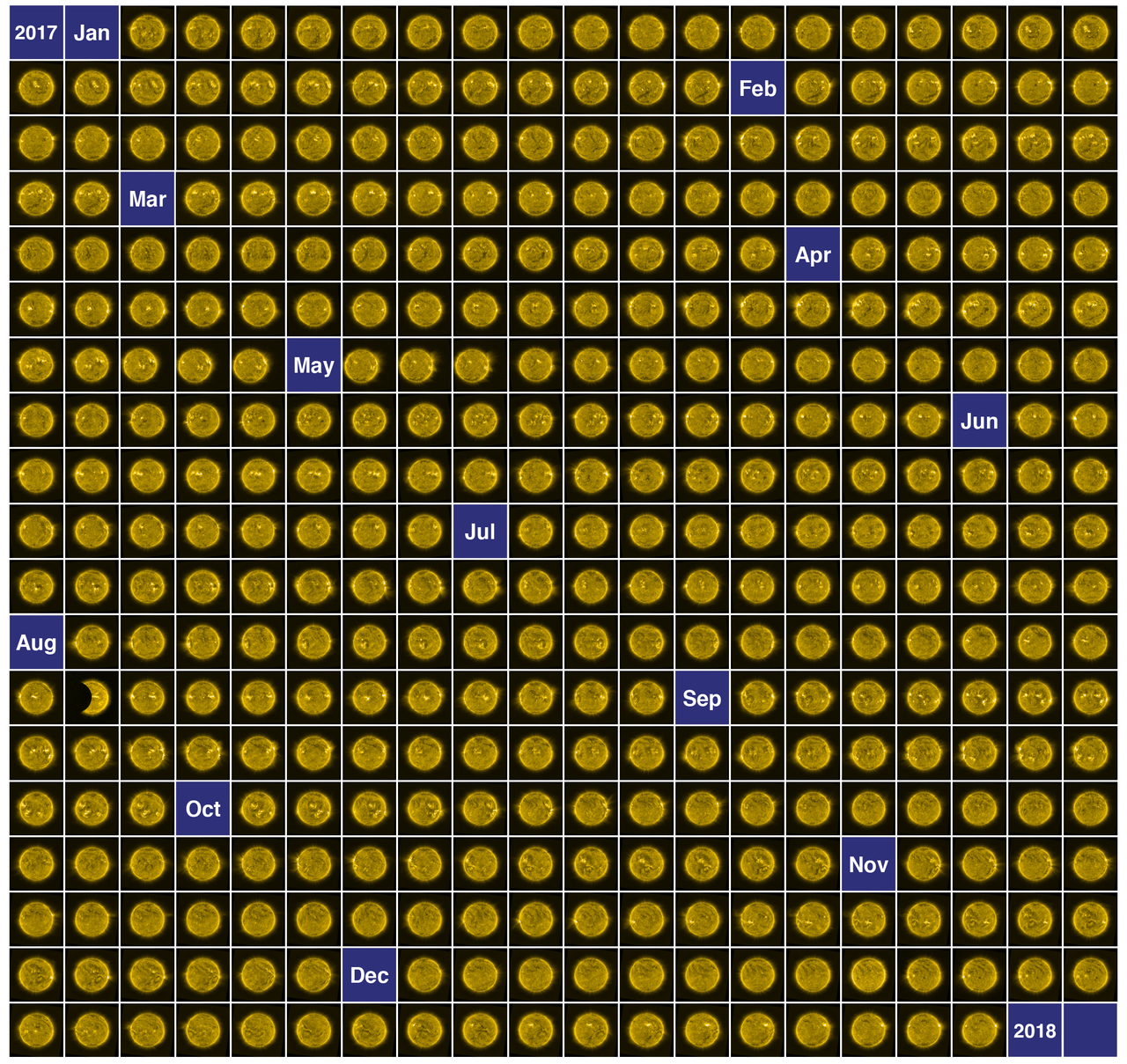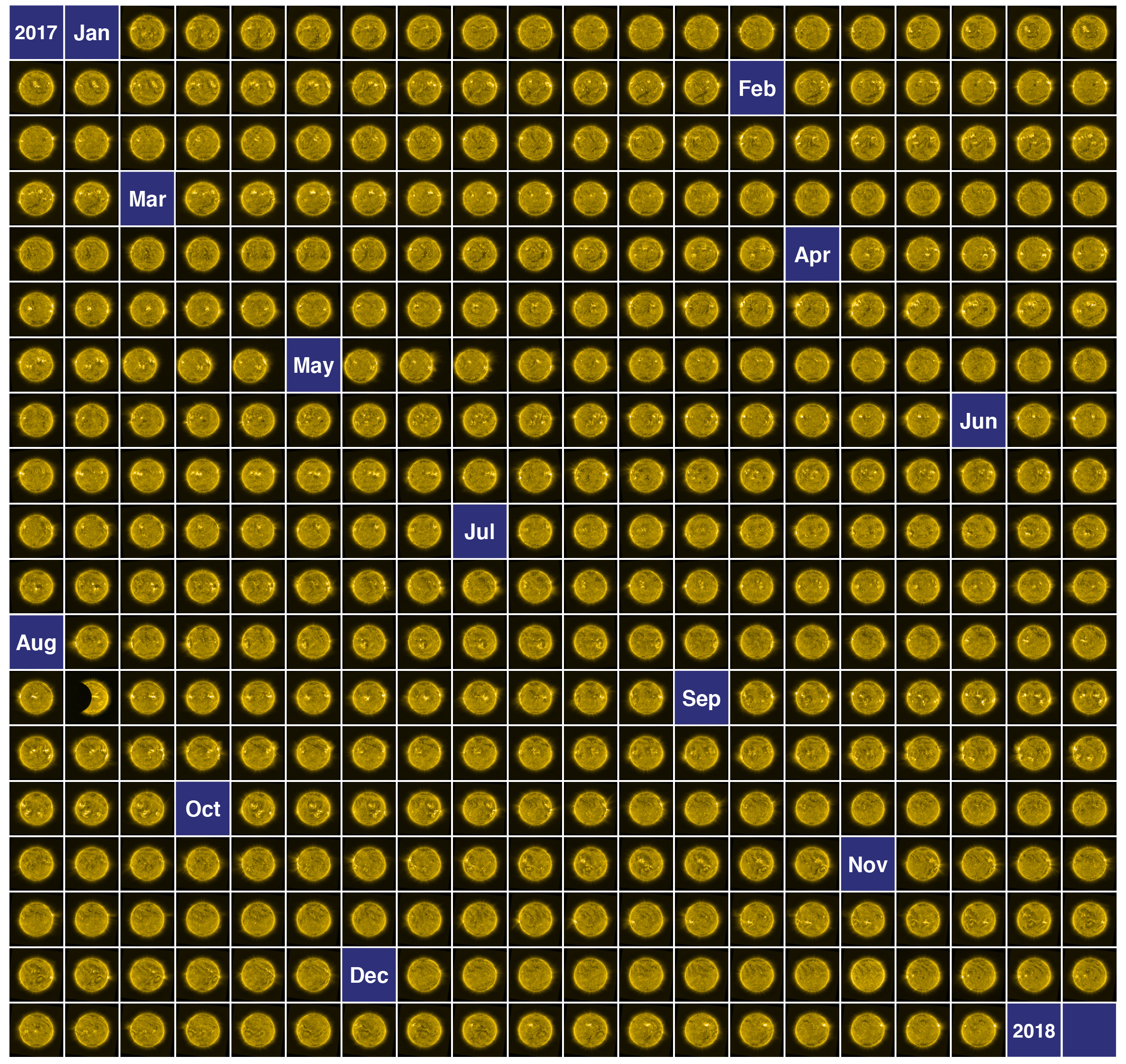 In general, the Sun's 11-year activity cycle continued throughout 2017 towards a minimum, a period when the number of active regions (seen as bright regions in the images) diminish, and coronal holes (seen as darker regions) are larger and more prominent.