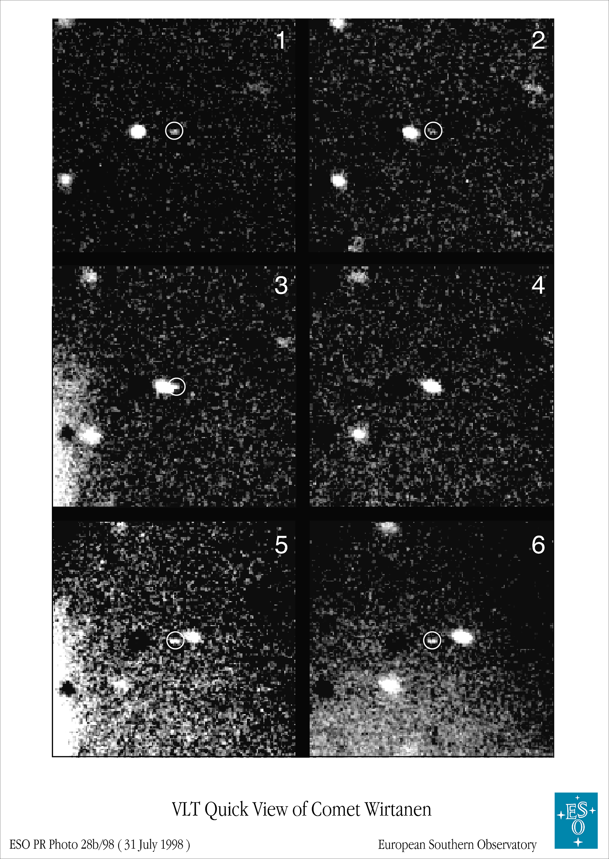 The photo mosaic is based on a series of 3-minute exposures through a red filter, obtained with the VLT Test Camera in the evening of July 28, 1998. They were performed in a bright sky (5-day old Moon high in the sky) that resulted in some straylight due to internal reflections in the telescope. In the first three pictures (1 - 3), the very faint image of the comet (in the circles and somewhat elongated because of the motion) approaches a brighter background star from the right hand side. It is hardly visible in the next (4), since it is in front of this star, and in the last two images (5 - 6), it reappears on the left side of the star. At the time of the observations, Comet Wirtanen was 605 million kilometres (4.05 AU) from the Earth and 630 million kilometres (4.20 AU) from the Sun. The estimated magnitude is approx. 23 or beyond, i.e. over 100 times fainter than that of Wild 2. It is an impressive feat of the UT1 to observe such a faint object in such a short time and under these mediocre conditions.