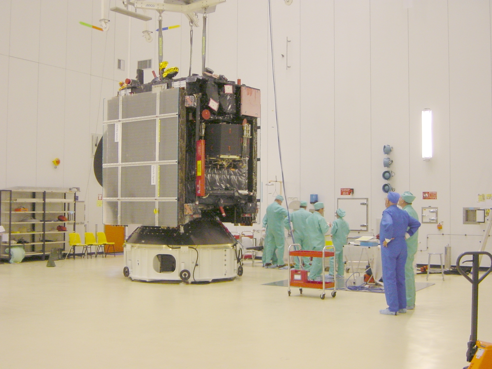 On Tuesday 10 February, the spacecraft was integrated with the mechanical and electrical launcher interfaces on the ACU. This image shows Rosetta resting on top of the conically shaped ACU, which is part of the launcher.