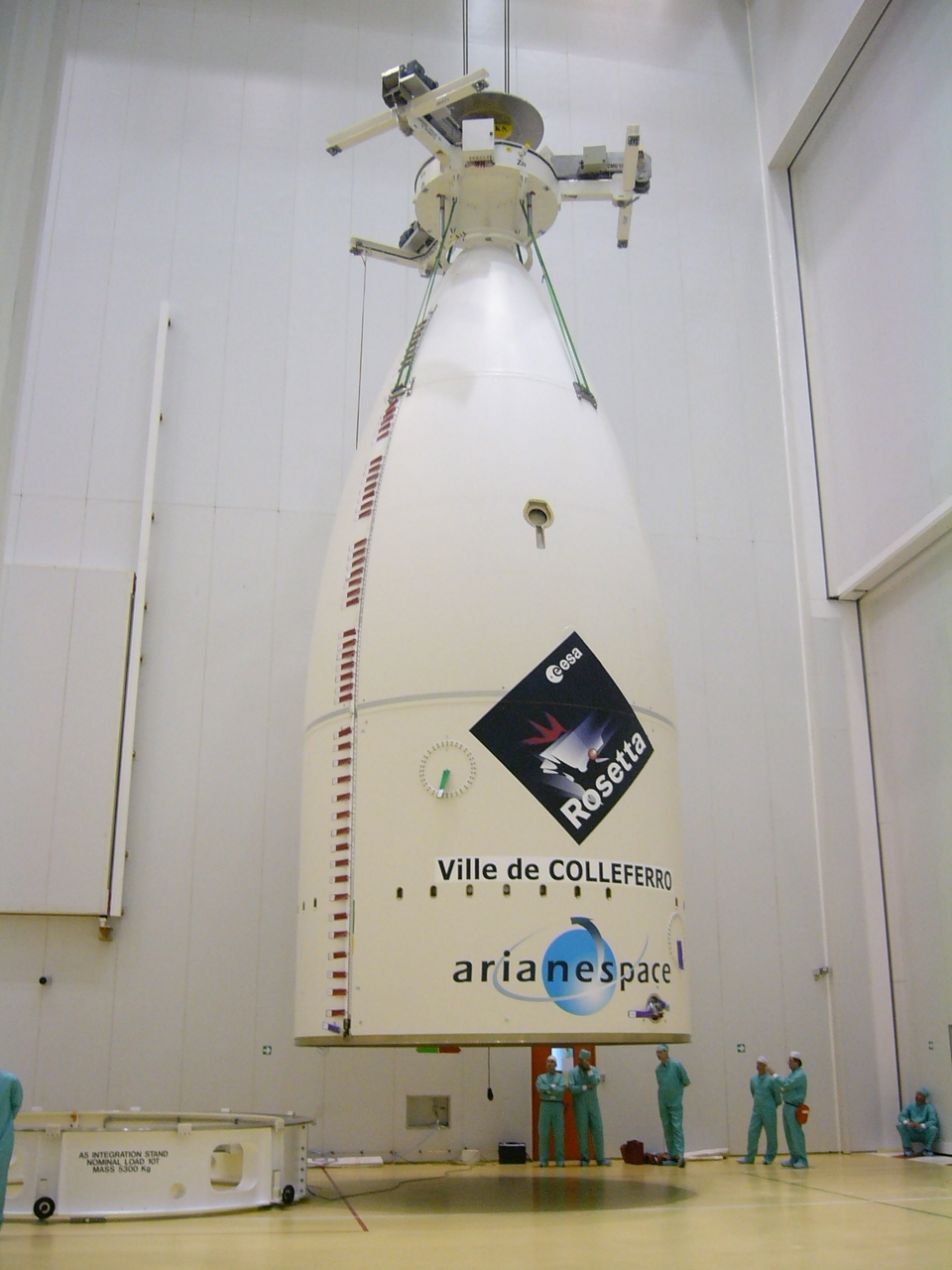 Late Tuesday evening, 17 February 2004, the fairing was lifted to the top of the launcher and placed over the Rosetta spacecraft. The fairing protects the spacecraft during the last days on the launch pad and during the first part of the flight itself. The fairing is jettisoned from the launcher about 3 minutes after lift-off.