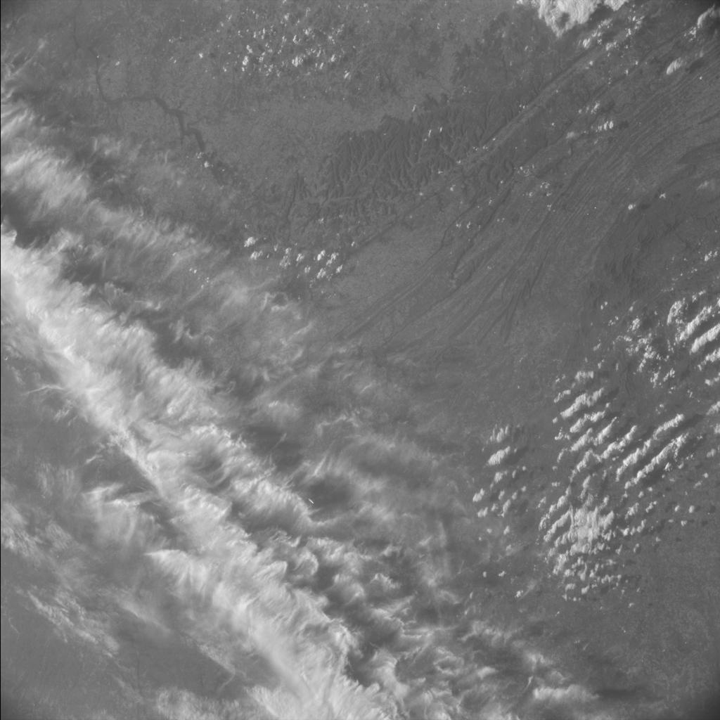 This image was taken at 21:59 UTC by one of Rosetta's Navigation Cameras during the spacecraft's first Earth swing-by on 4 March 2005. It shows cloud formations over the southern portion of the Appalachian Mountains.