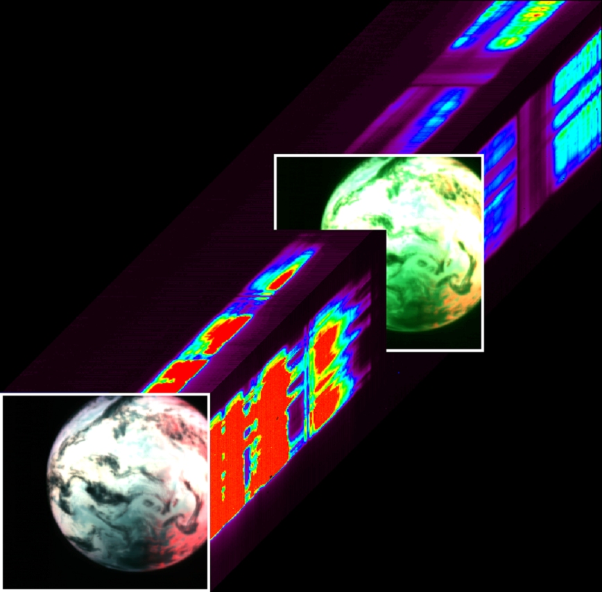 The Earth image has been obtained in 432 bands in the visible (between 0.25 and 1 micrometers) and 432 bands in the infrared (between 1.0 and 5 micrometers).