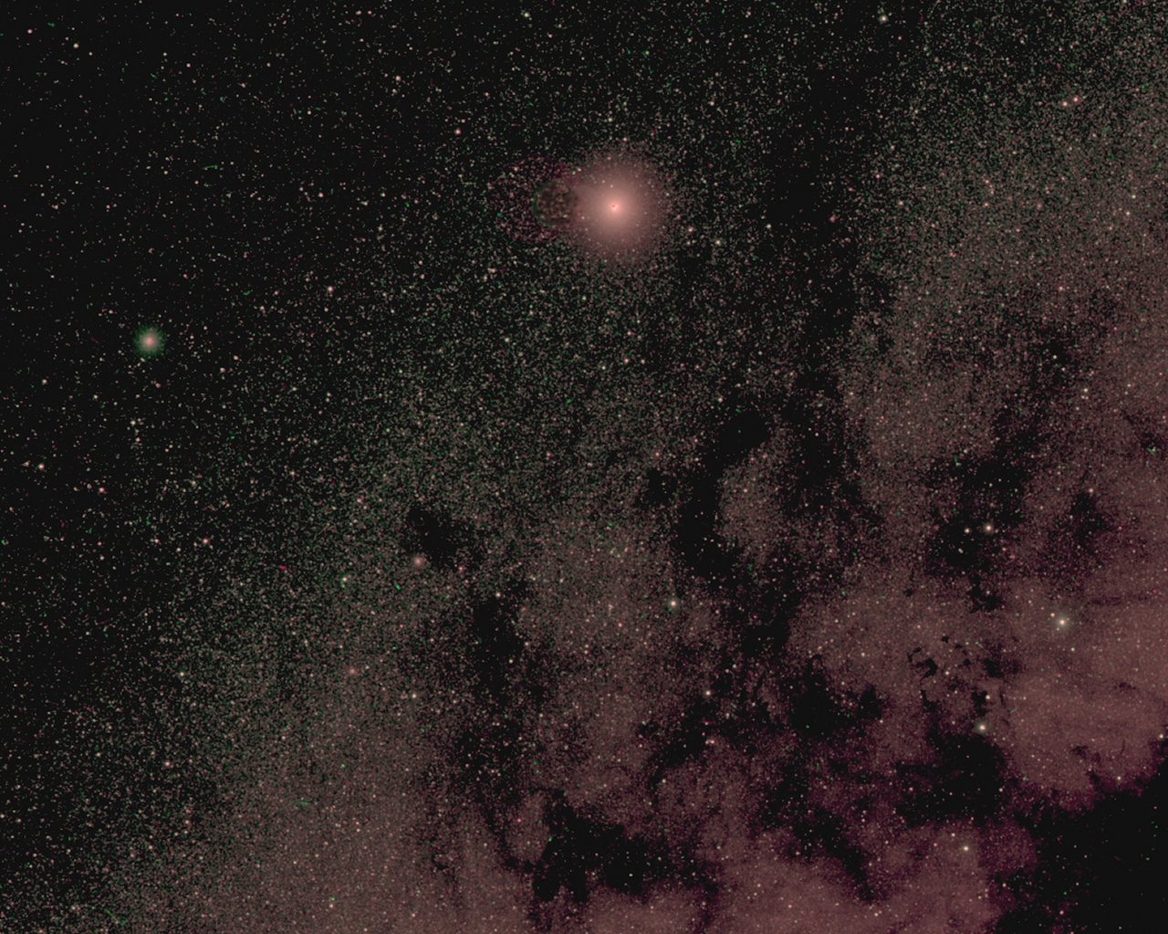 This view of Mars against the backdrop of our Galaxy was taken by the wide angle camera (WAC) of the OSIRIS instrument on 3 December 2006, during the last series of instrument check-outs. In the image, Mars is heavily overexposed, surrounded by a halo of scattered light.
