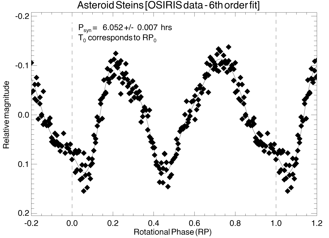 Asteroid 2867 Steins is one of two asteroids (the other being 21 Lutetia) that Rosetta will fly by on its way to comet 67 P/Churyumov-Gerasimenko. This plot shows the variation of the asteroid's apparent magnitude as measured by the OSIRIS Narrow Angle Camera on 11 March 2006 from a distance of 159 million kilometres (1.06 AU). The data were gathered during a single 24 hour period and show the asteroid has a spin period of just over six hours (6.052), in good agreement with ground based observations.